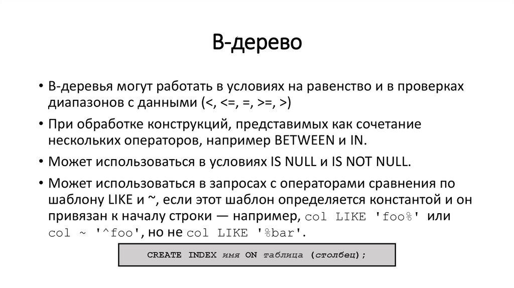 • По умолчанию команда CREATE INDEX создаёт индексы-B-деревья, эффективные в большинстве