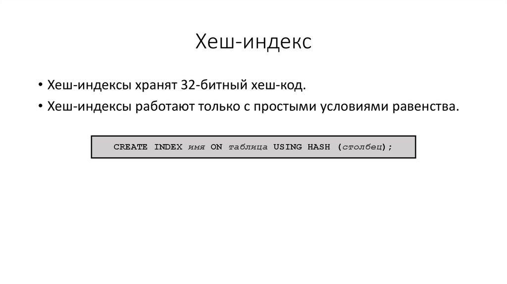 Хеш-индекс• Хеш-индексы хранят 32-битный хеш-код.