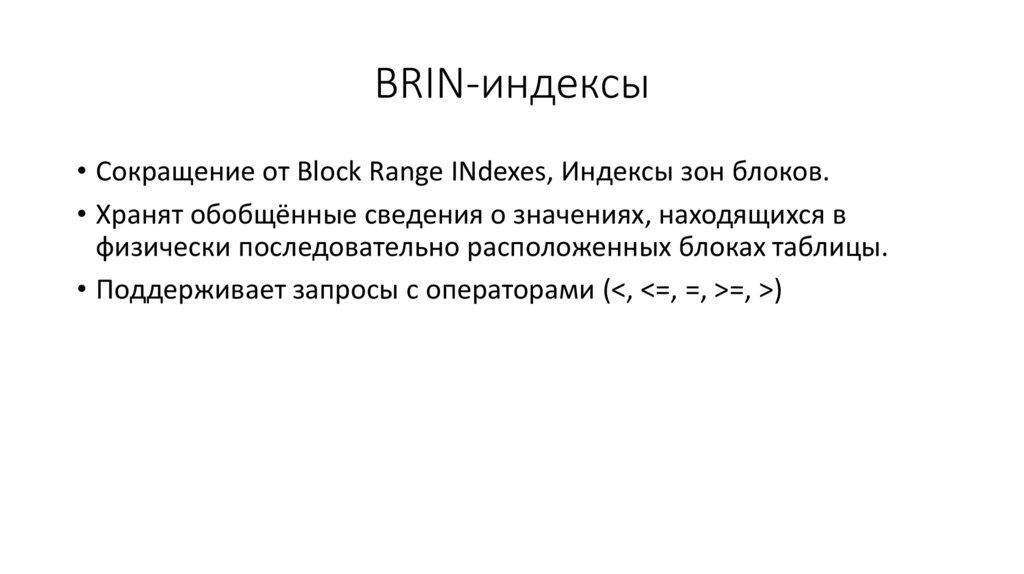 BRIN-индексы• Сокращение от Block Range INdexes, Индексы зон блоков.