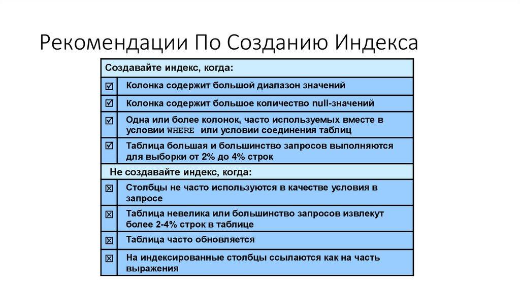 Рекомендации По Созданию ИндексаСоздавайте индекс, когда: