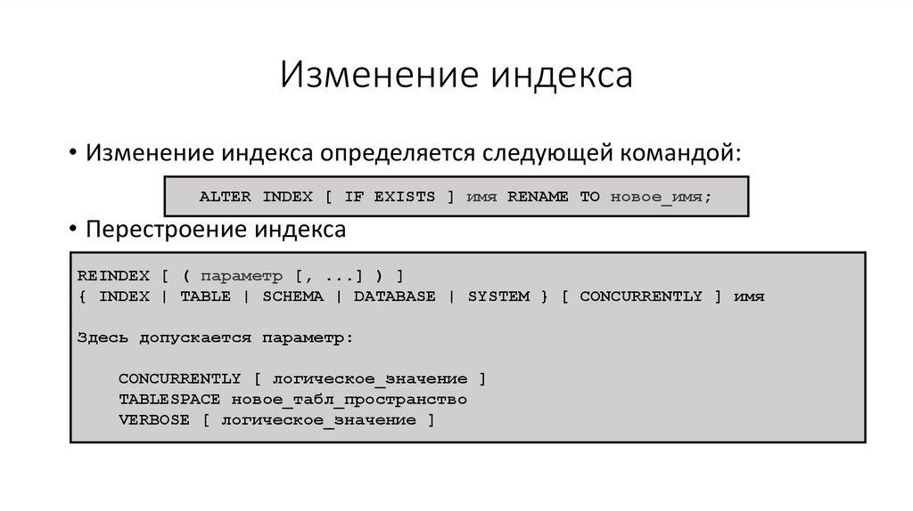Изменение индекса• Изменение индекса определяется следующей командой: