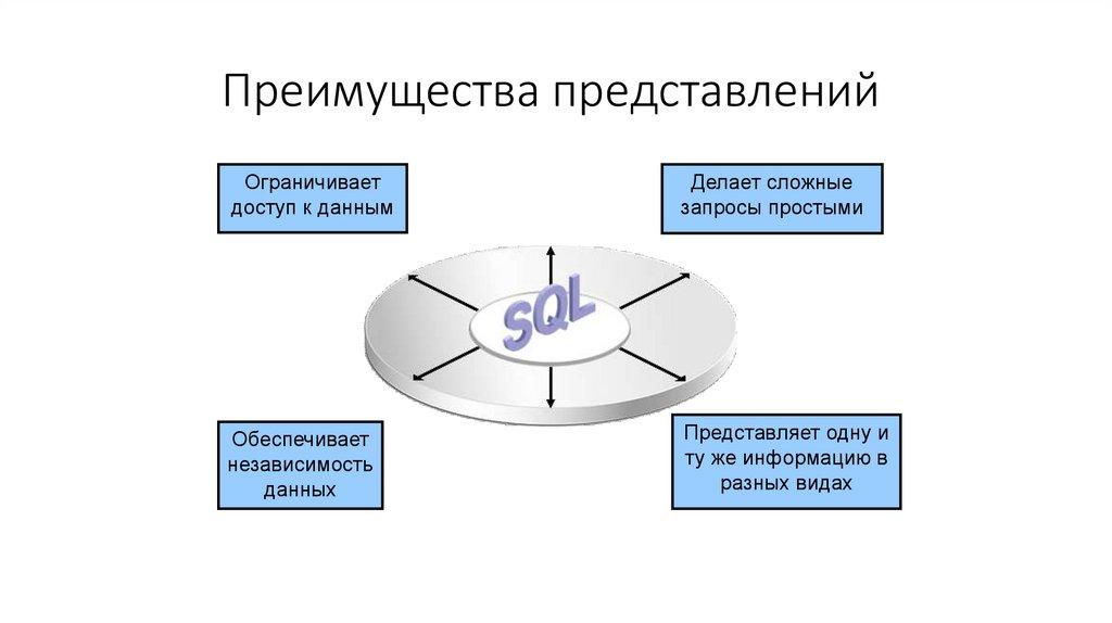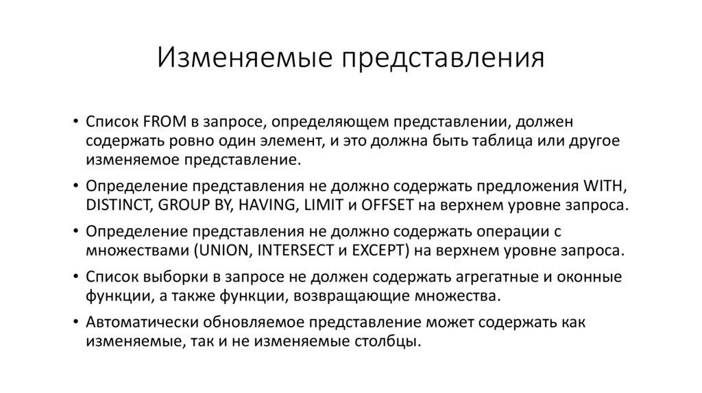 Изменяемые представления• Список FROM в запросе, определяющем представлении, должен
