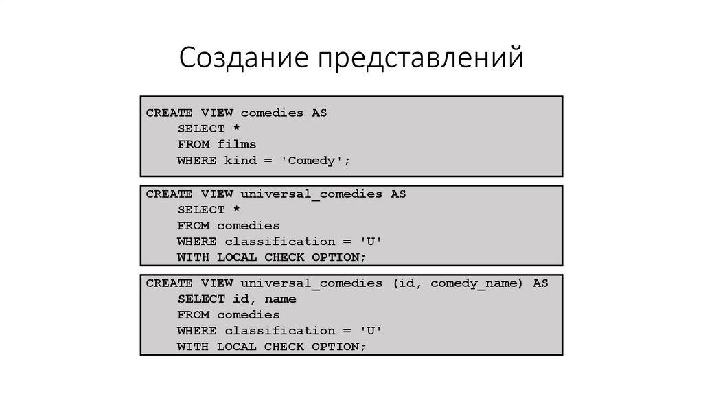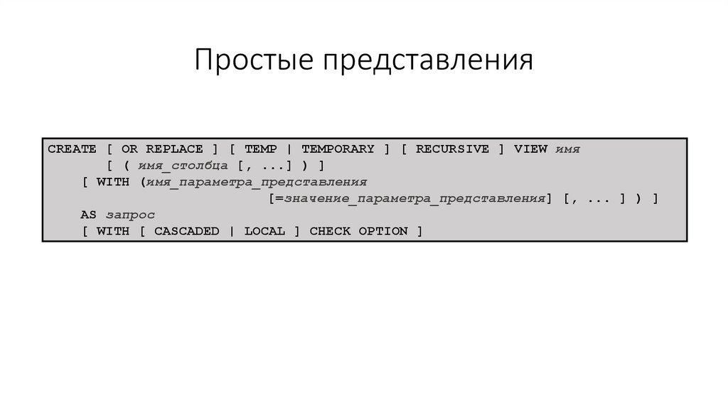 Простые представленияCREATE [ OR REPLACE ] [ TEMP | TEMPORARY ] [ RECURSIVE ] VIEW имя
