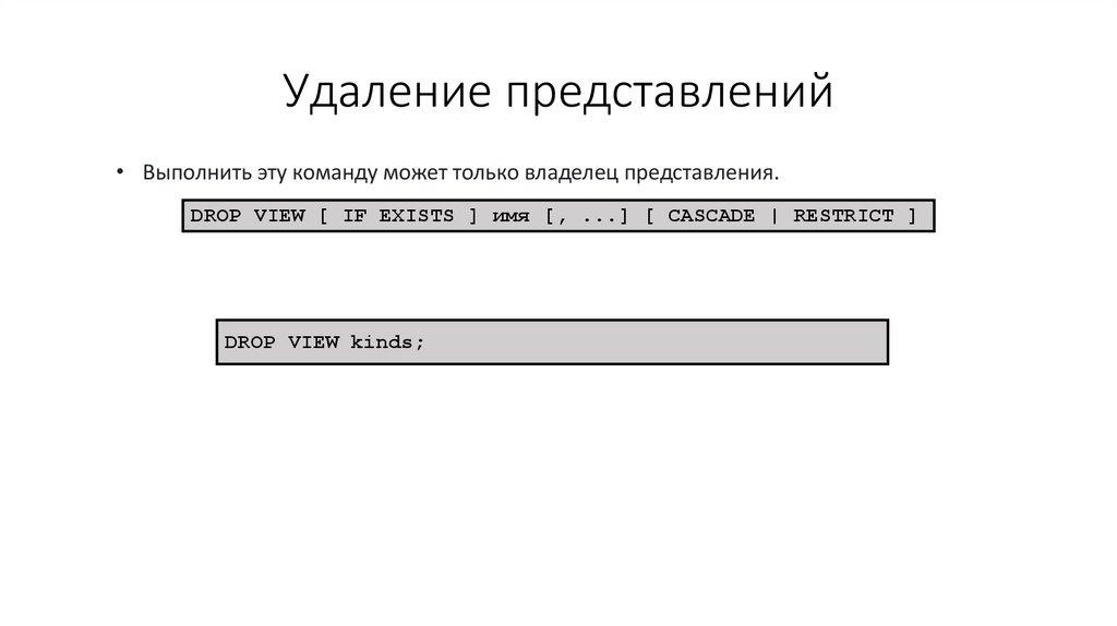 Удаление представлений• Выполнить эту команду может только владелец представления.