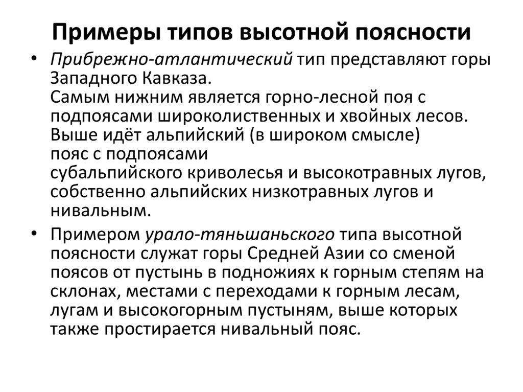 Примеры типов высотной поясности• Прибрежно-атлантический тип представляют горы