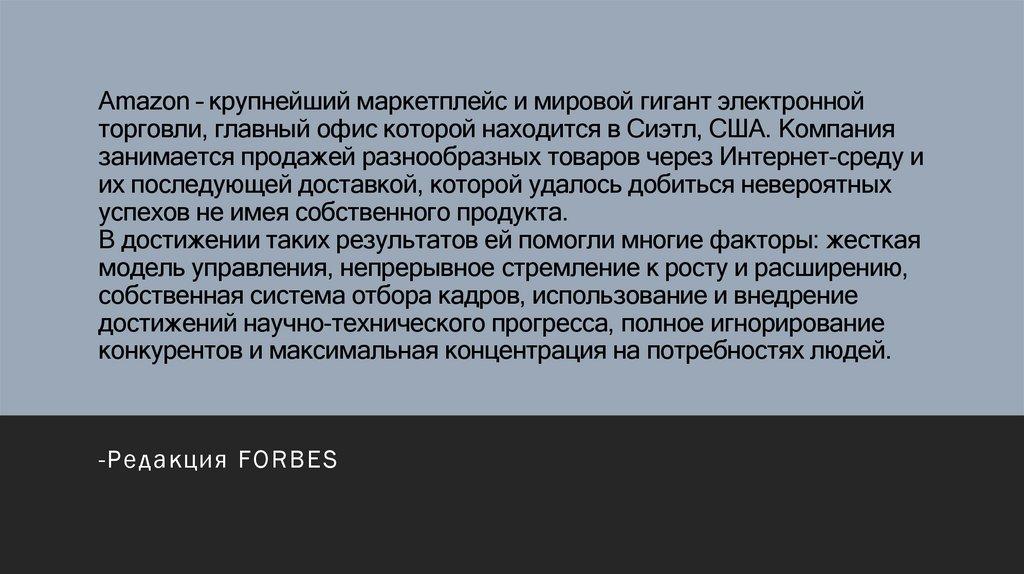 Amazon – крупнейший маркетплейс и мировой гигант электроннойторговли, главный офис которой находится в Сиэтл, США. Компания