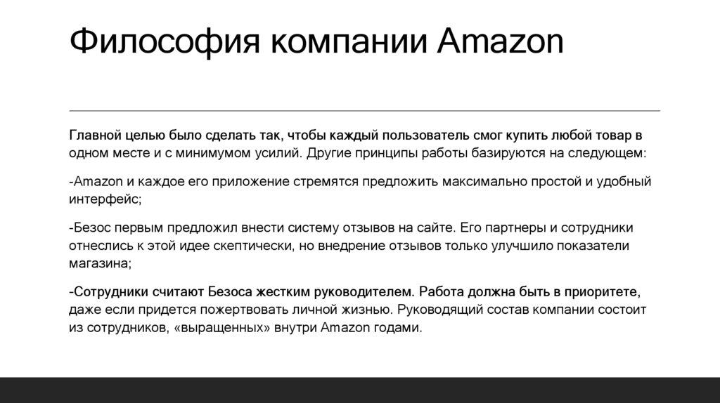 Философия компании AmazonГлавной целью было сделать так, чтобы каждый пользователь смог купить любой товар в