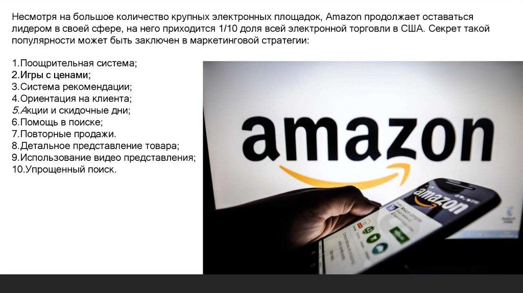 Несмотря на большое количество крупных электронных площадок, Amazon продолжает оставатьсялидером в своей сфере, на него приходится 1/10 доля всей электронной торговли в США. Секрет такой