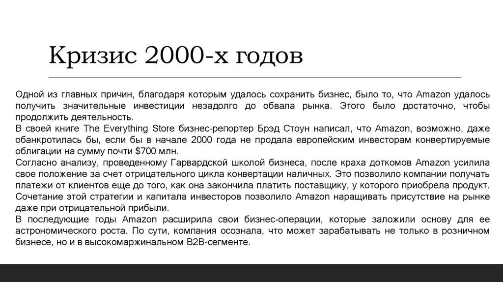 Кризис 2000-х годовОдной из главных причин, благодаря которым удалось сохранить бизнес, было то, что Amazon удалось