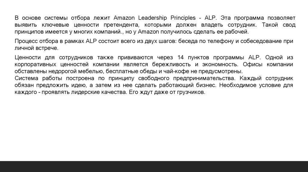 В основе системы отбора лежит Amazon Leadership Principles - ALP. Эта программа позволяетвыявить ключевые ценности претендента, которыми должен владеть сотрудник. Такой свод