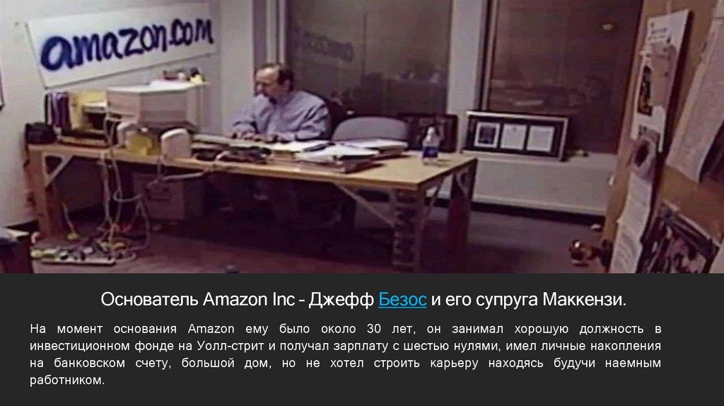 Основатель Amazon Inc – Джефф Безос и его супруга Маккензи.На момент основания Amazon ему было около 30 лет, он занимал хорошую должность в