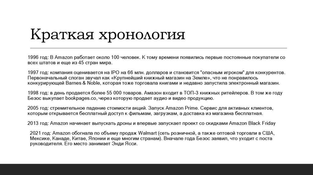 Краткая хронология1996 год: В Amazon работает около 100 человек. К тому времени появились первые постоянные покупатели со