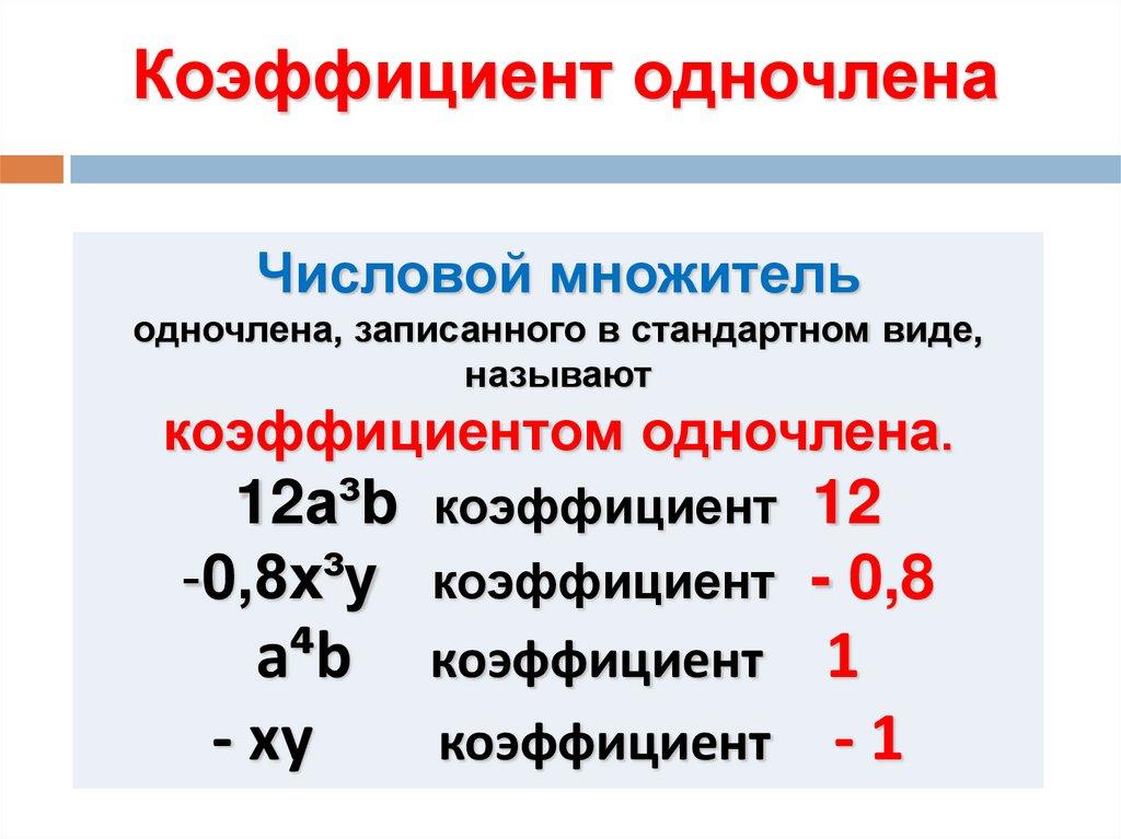 Научить находить коэффициент и степень одночлена.