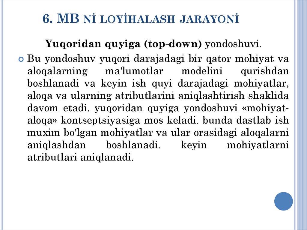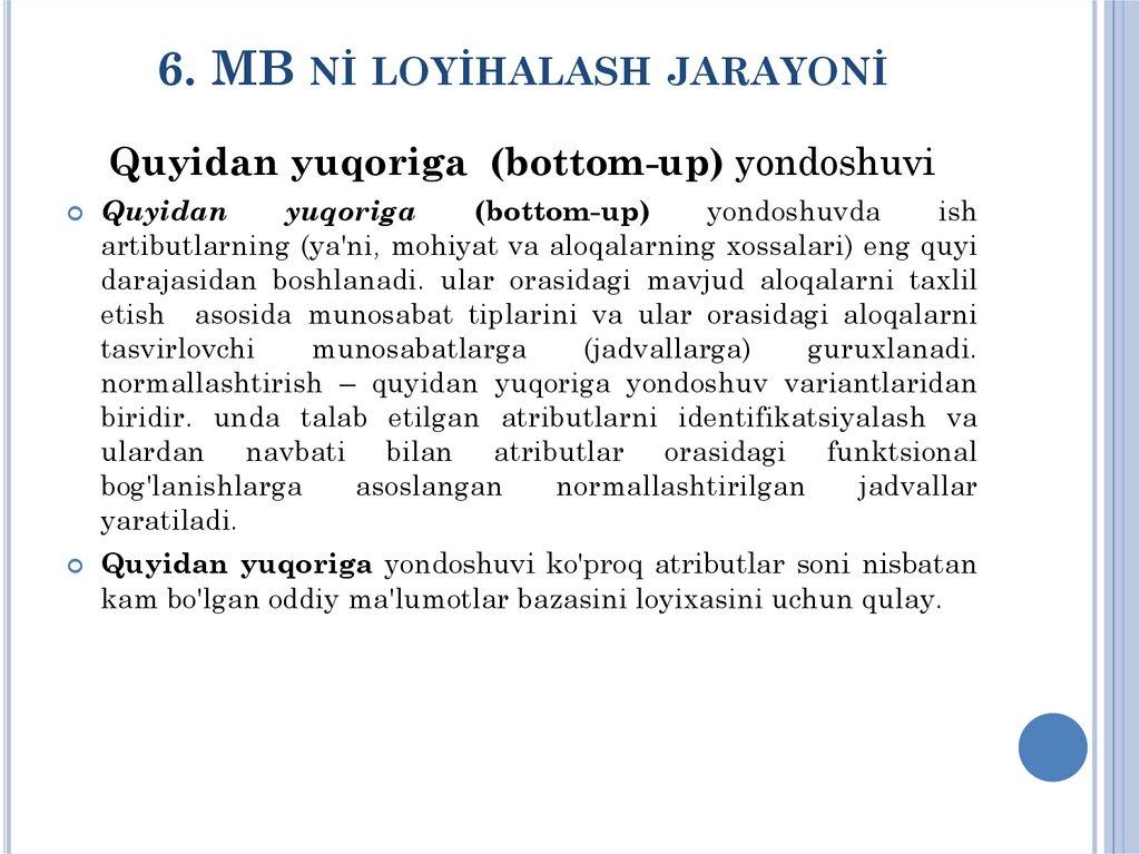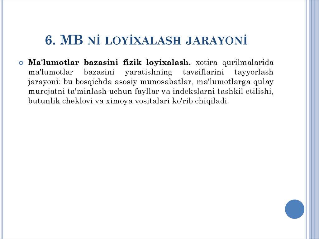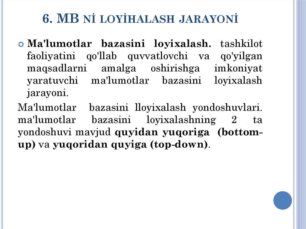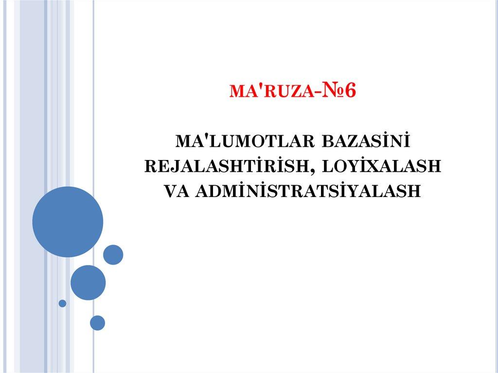 MA'RUZA-№6MA'LUMOTLAR BAZASİNİ