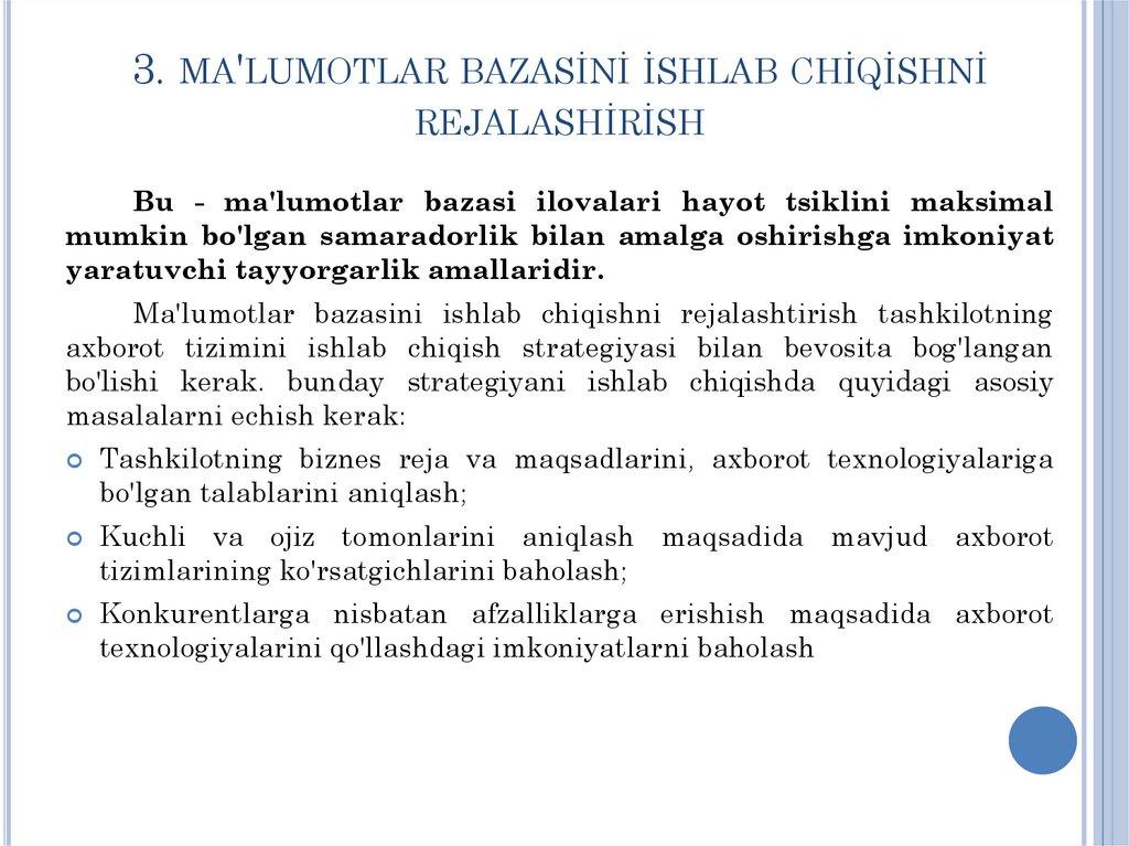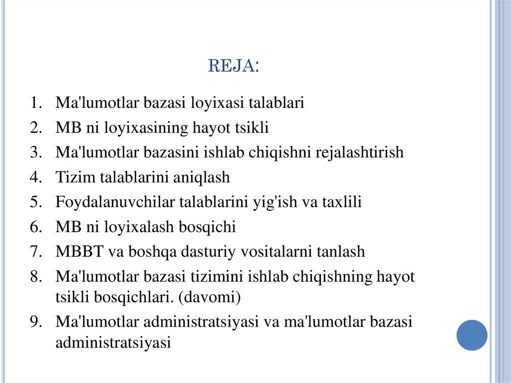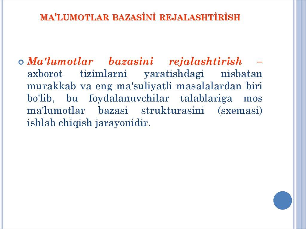 MA'LUMOTLAR BAZASİNİ REJALASHTİRİSHMa'lumotlar
