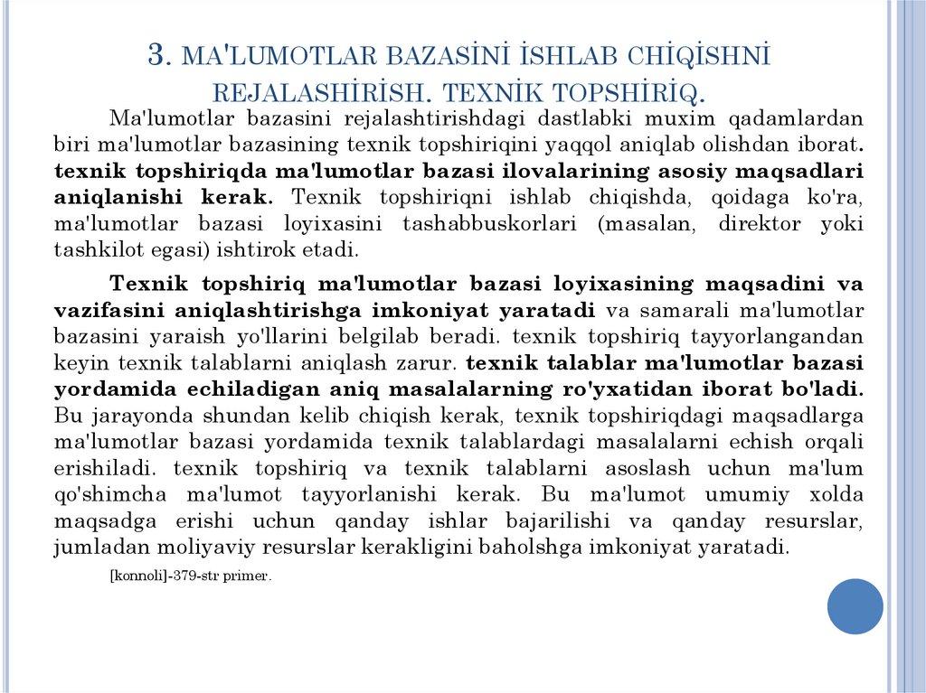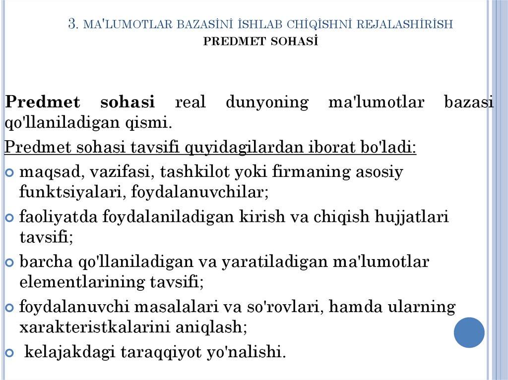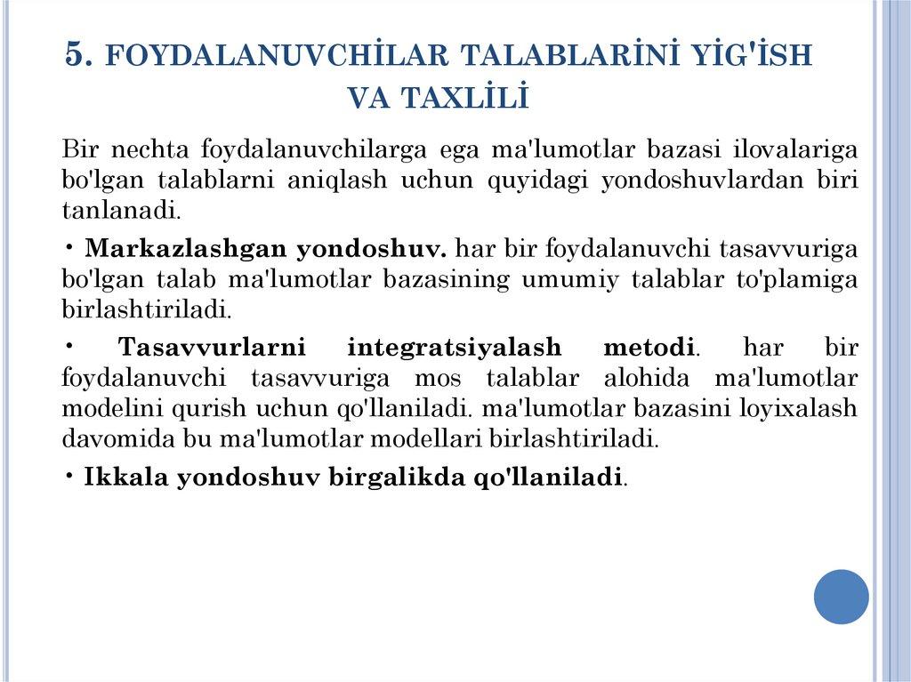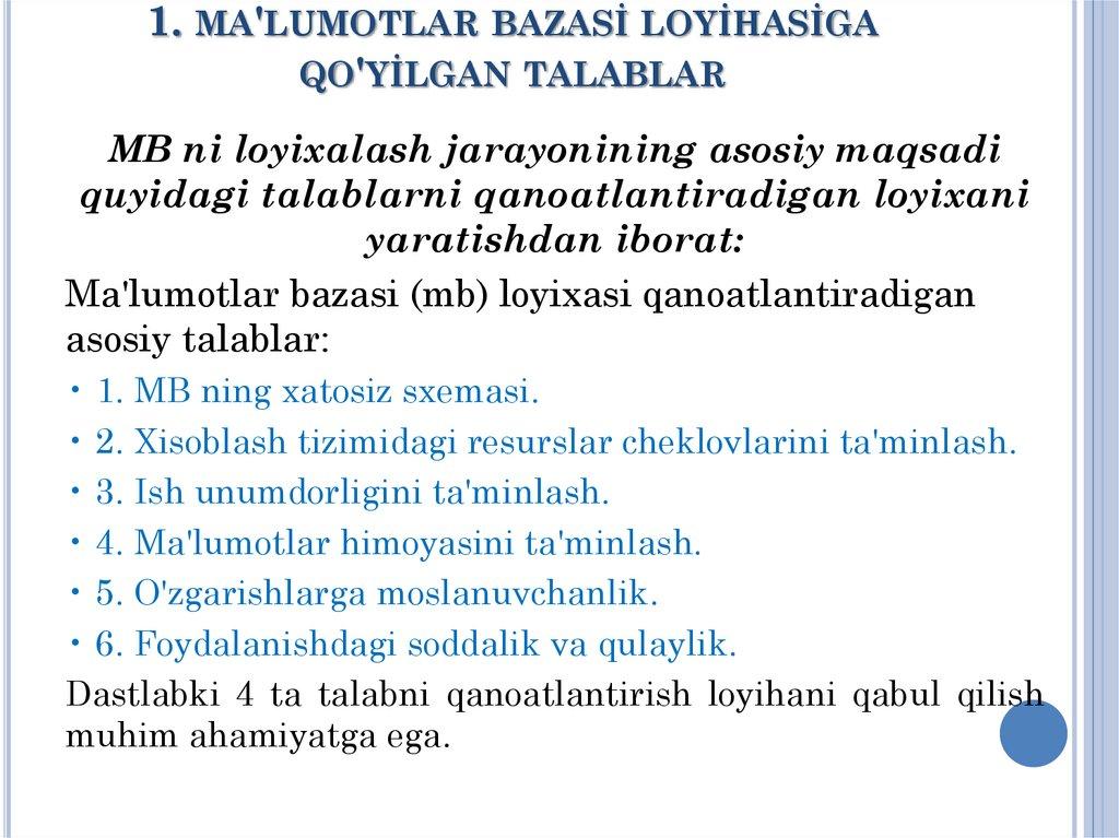 1. MA'LUMOTLAR BAZASİ LOYİHASİGAQO'YİLGAN TALABLAR
