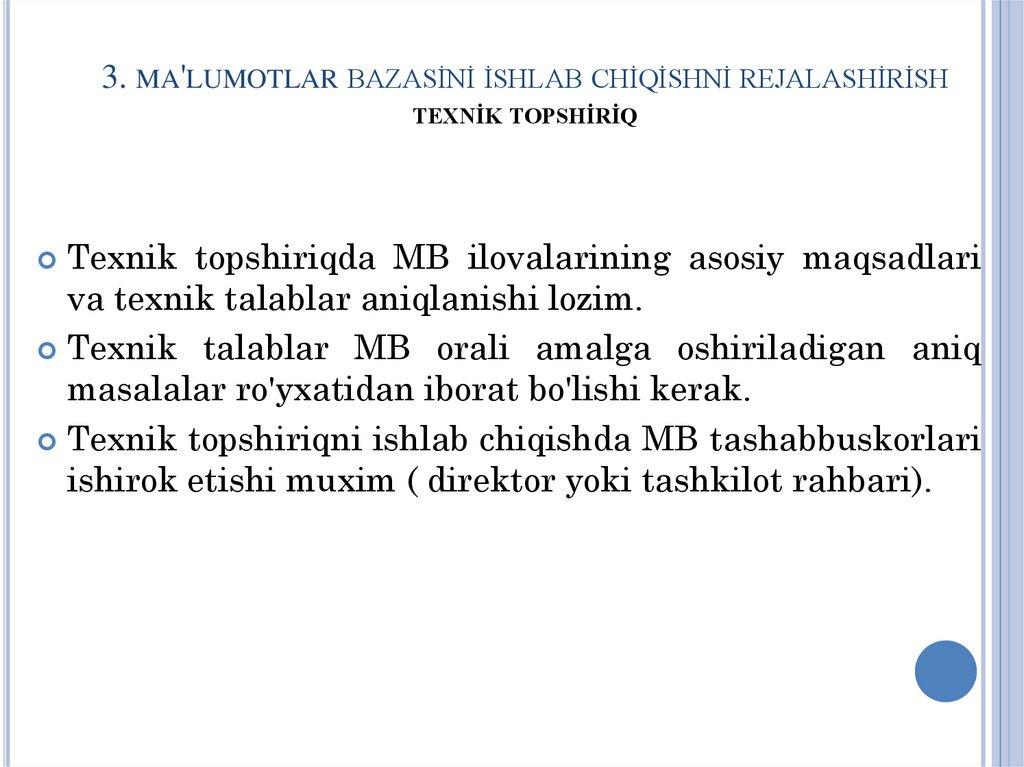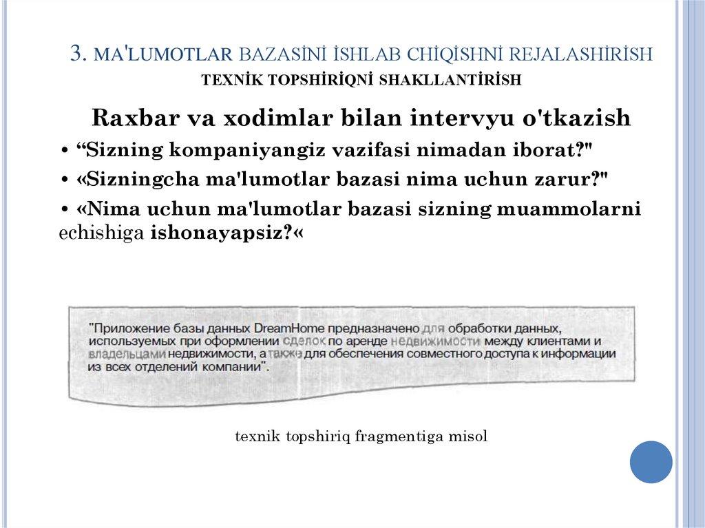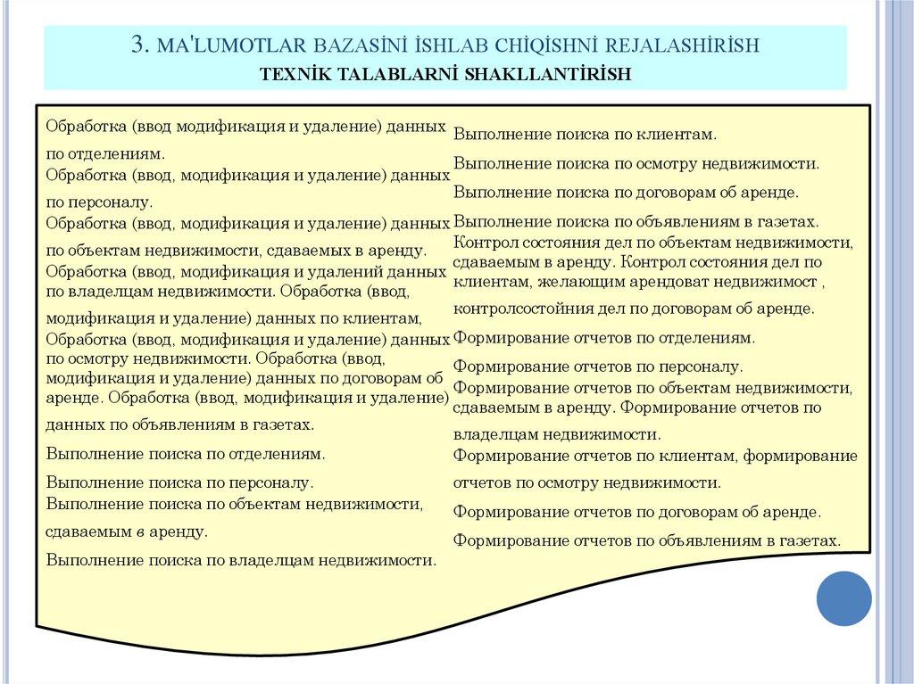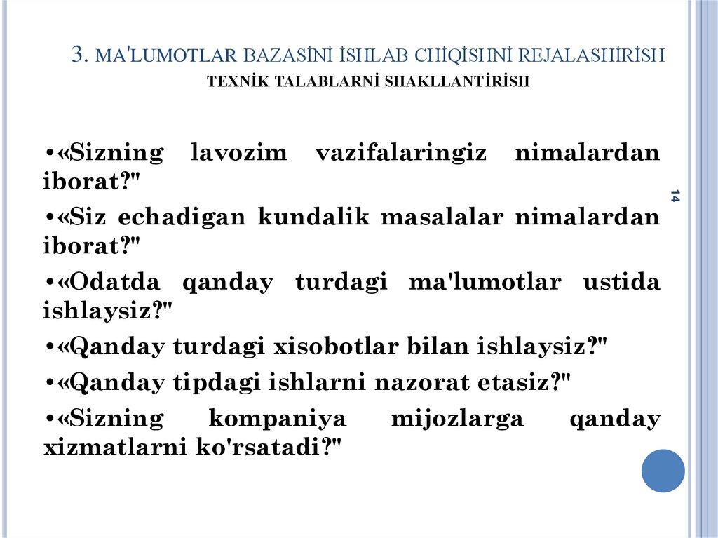 1. MA'LUMOTLAR BAZASİ LOYİHASİGAQO'YİLGAN TALABLAR