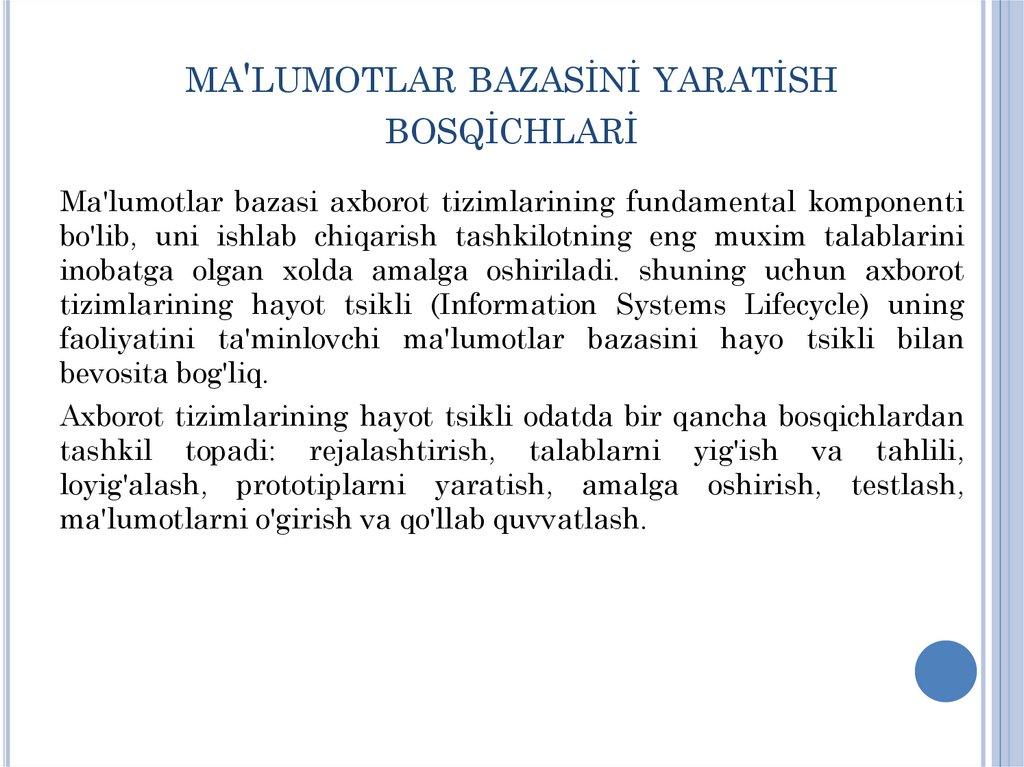 MA'LUMOTLAR BAZASİNİ YARATİSHBOSQİCHLARİ