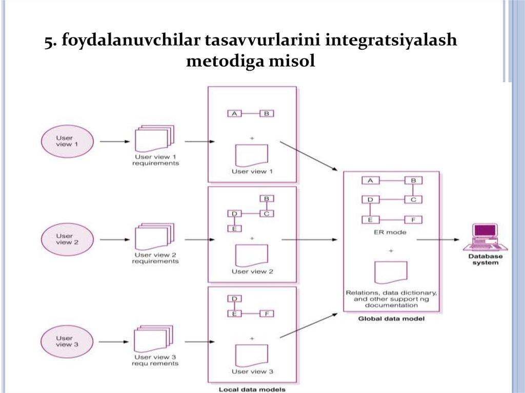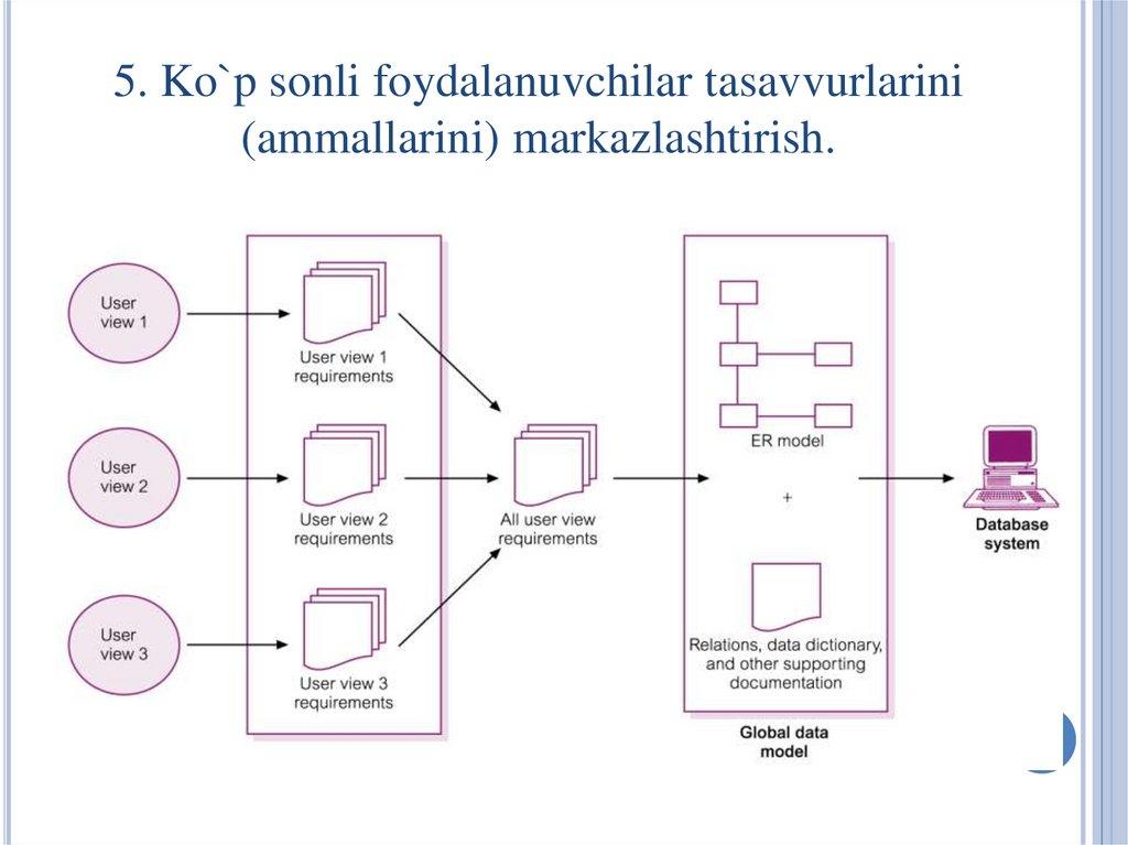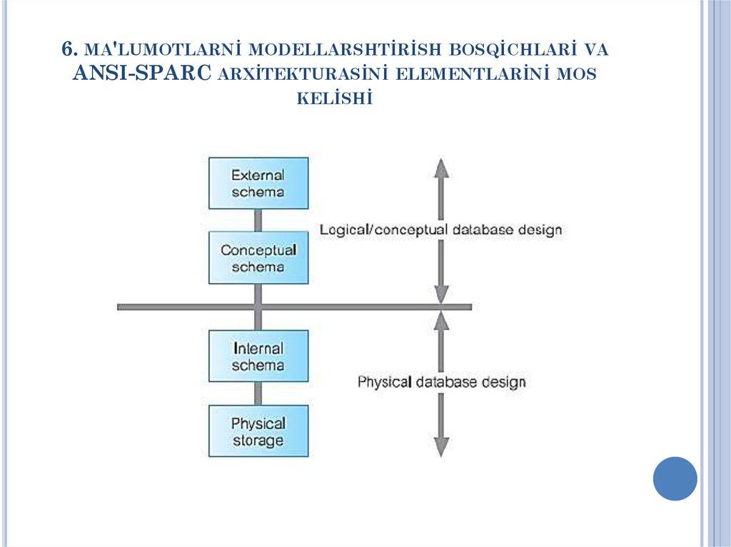 • ma'lumotlar bazasini kontseptual va mantiqiy • ma'lumotlar bazasini mantiqiy va fizik
