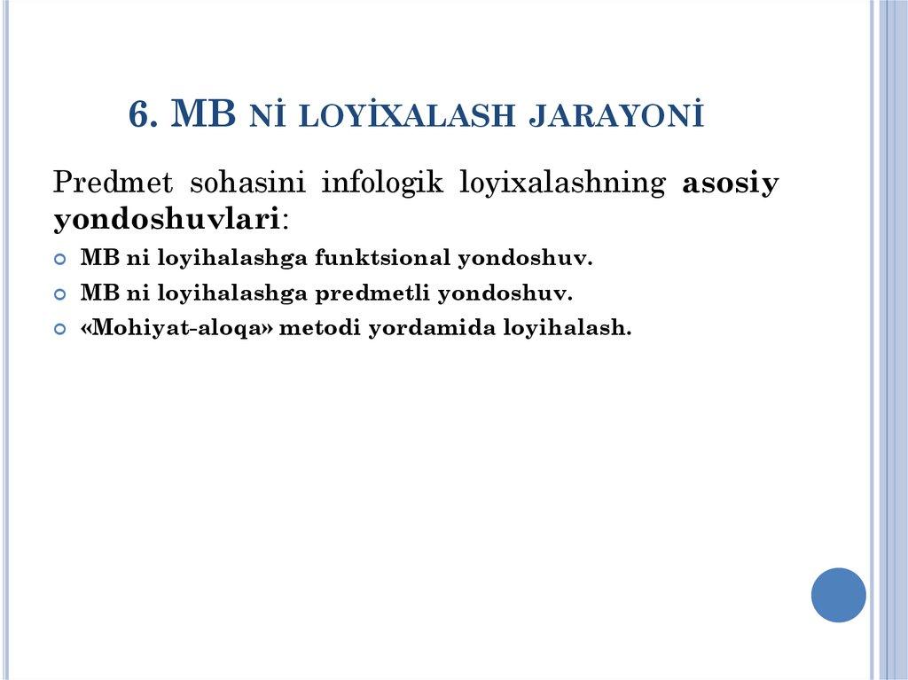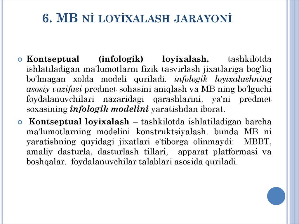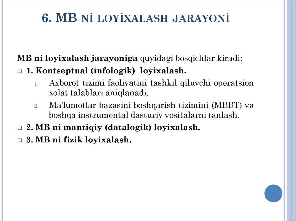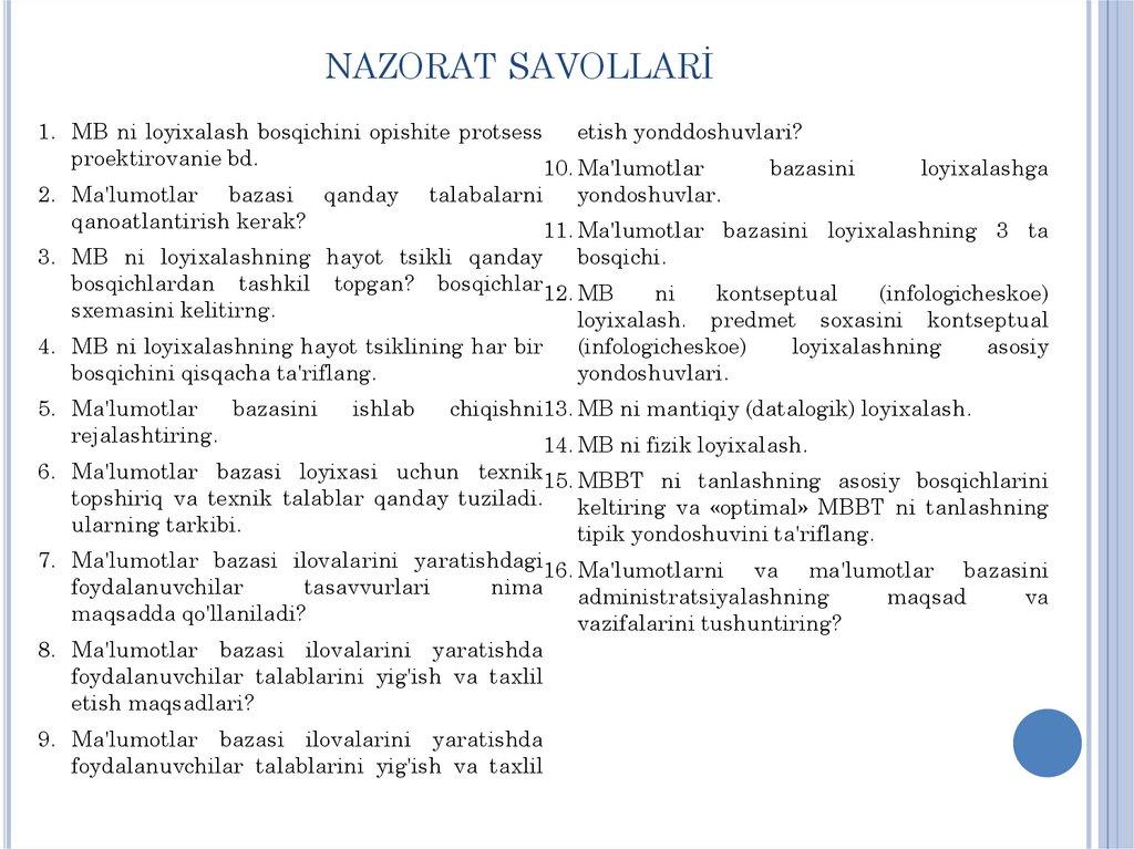 NAZORAT SAVOLLARİ1. MB ni loyixalash bosqichini opishite protsess