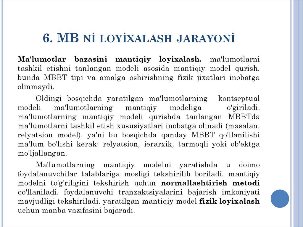 chiqishni13. MB ni mantiqiy (datalogik) loyixalash.