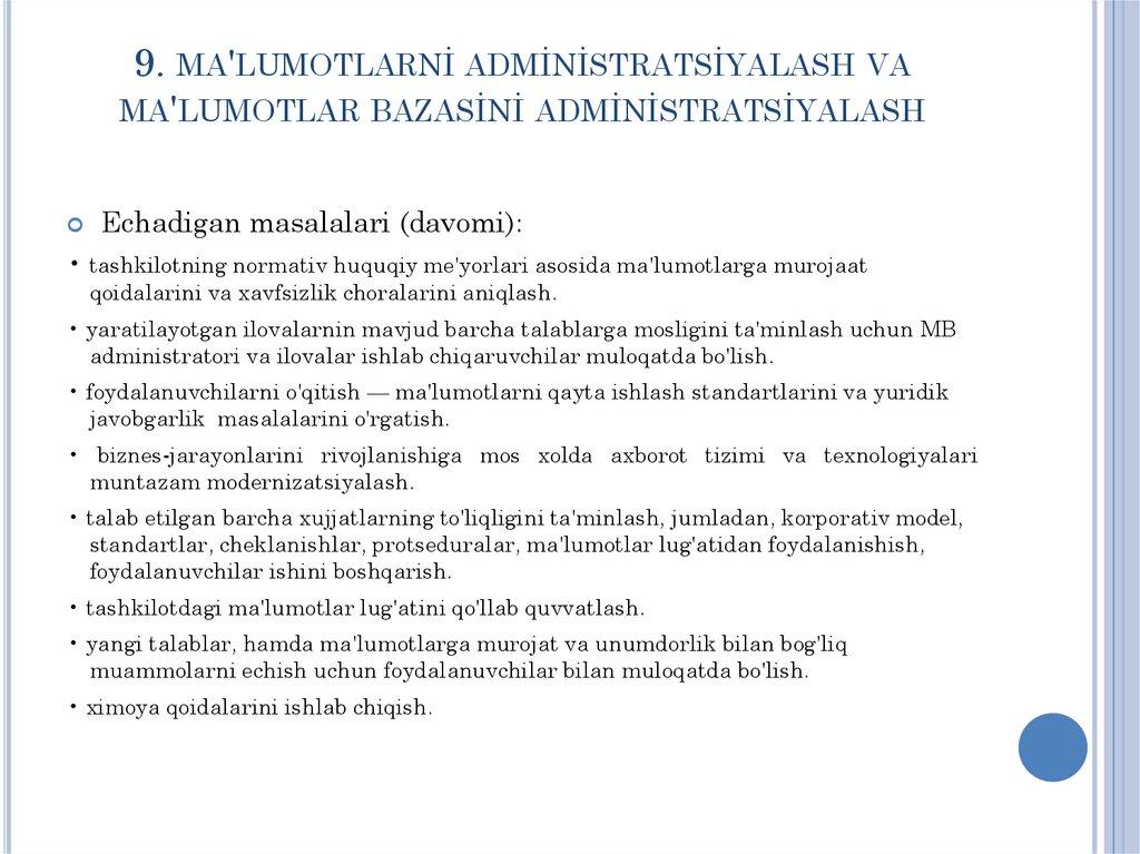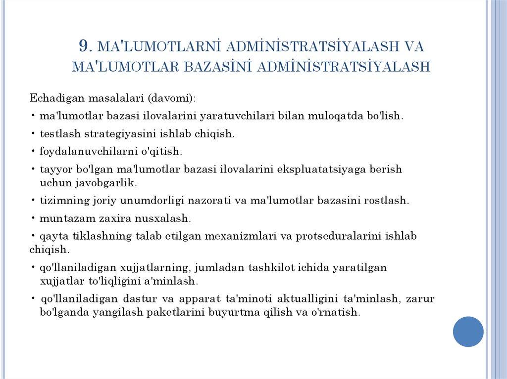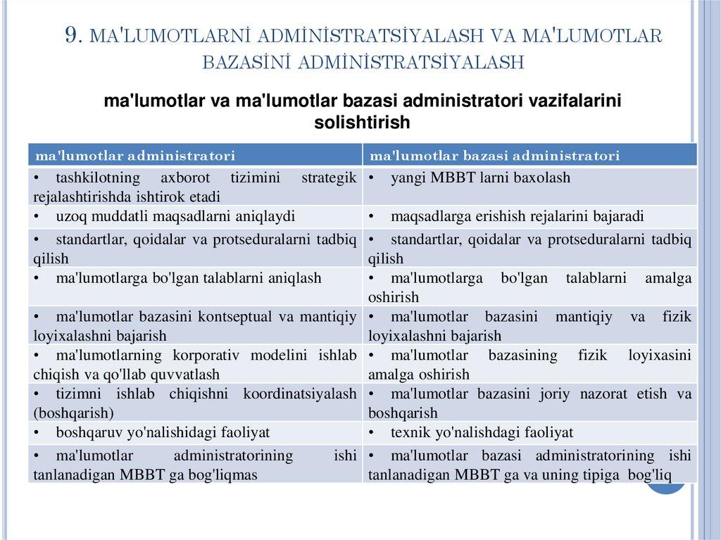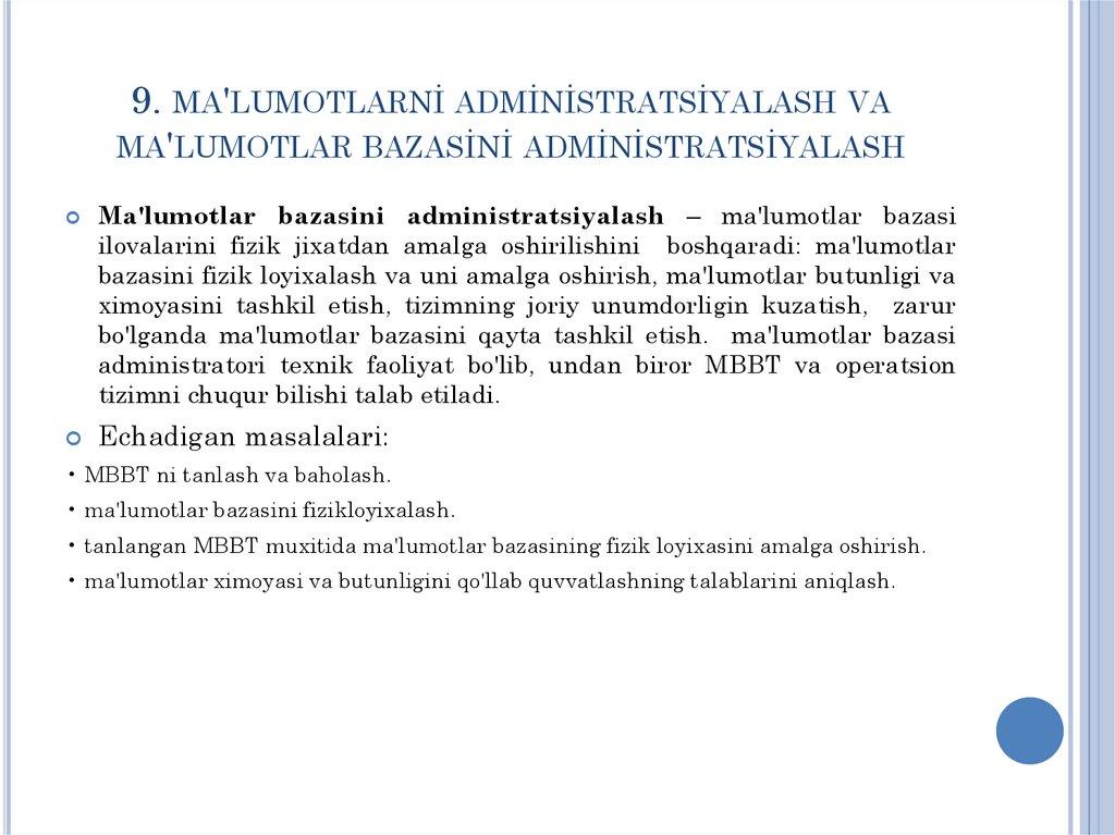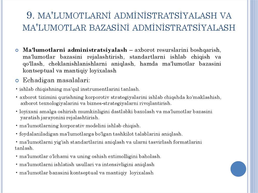 9. Ma'lumotlar administratsiyasi va ma'lumotlar bazasi