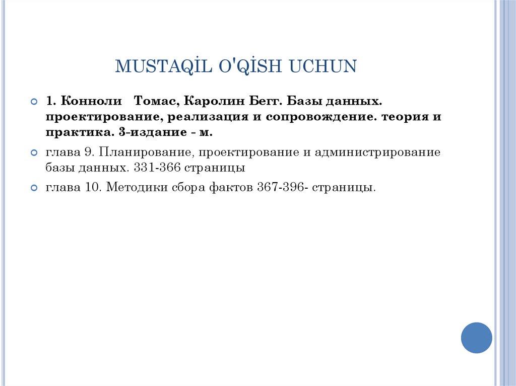 MUSTAQİL O'QİSH UCHUN1. Конноли Томас, Каролин Бегг. Базы данных.
