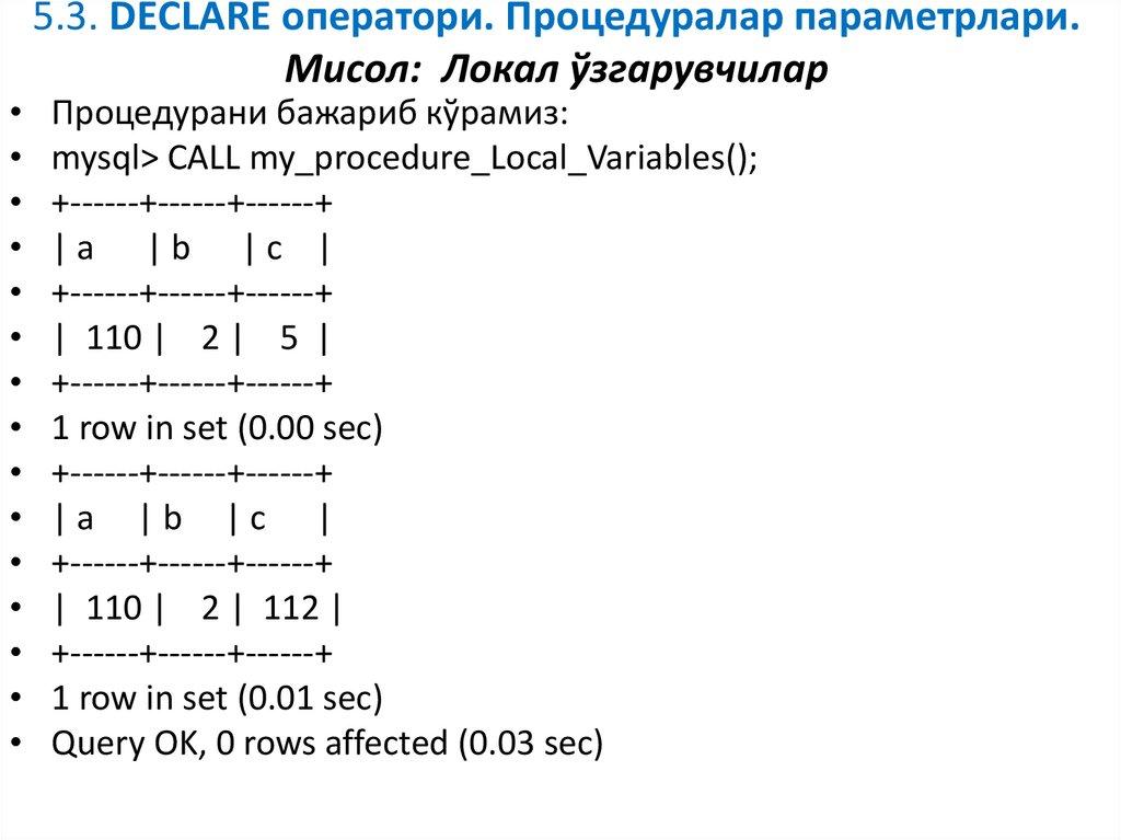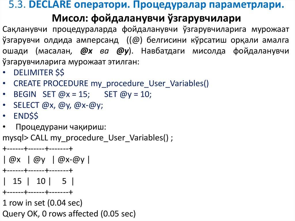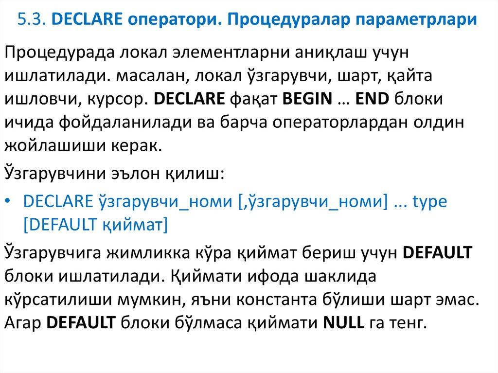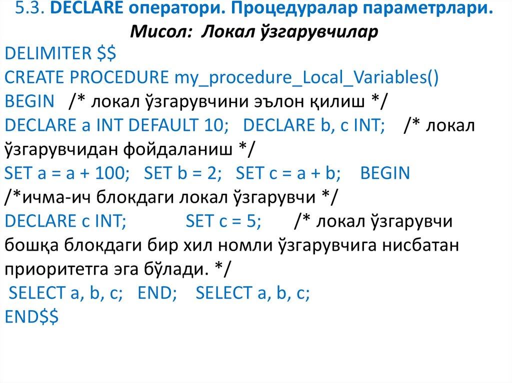 7. SQL процедуранинг ўзгарувчилари. Оператор DECLARE.