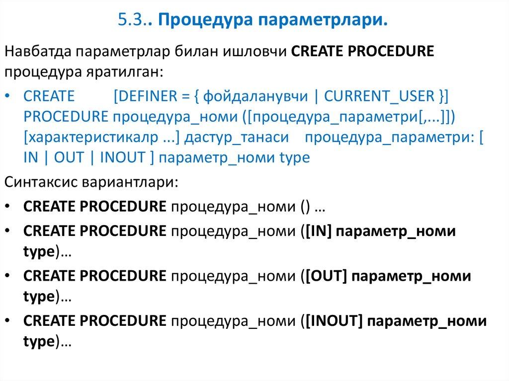 • CREATE PROCEDURE процедура_номи ([INOUT] параметр_номи