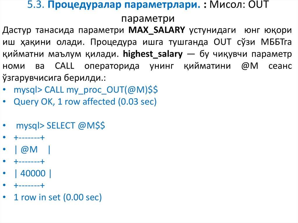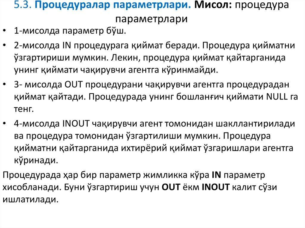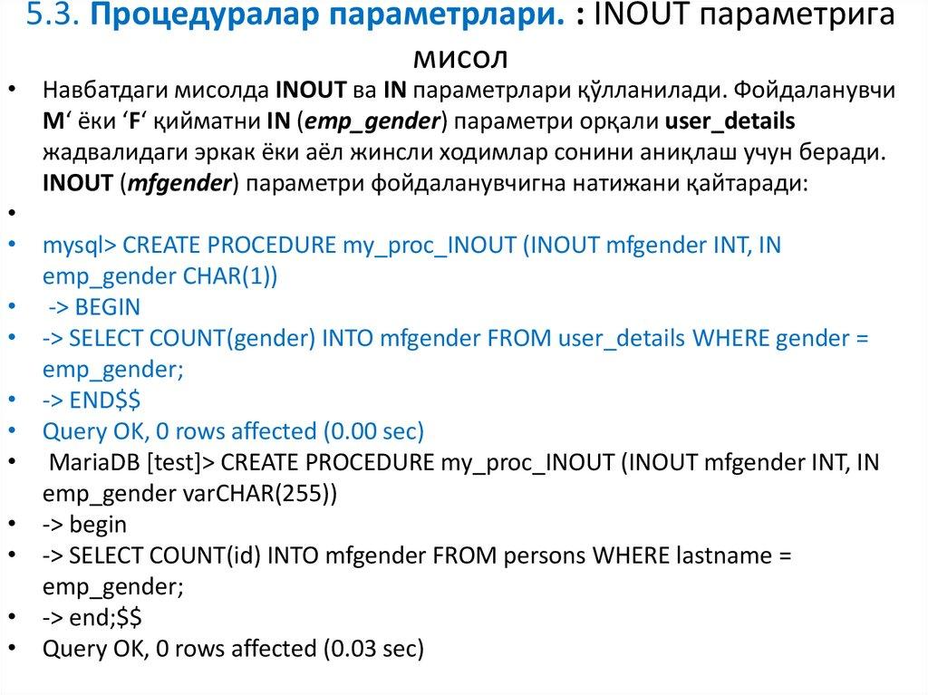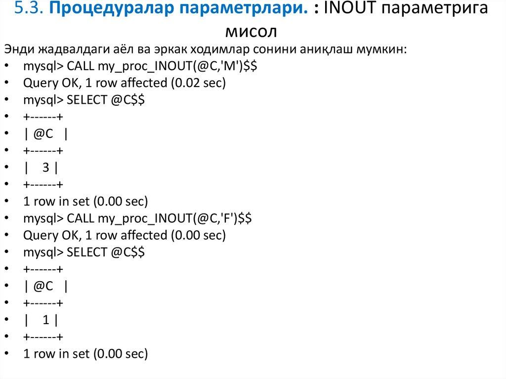 • Навбатдаги мисолда INOUT ва IN параметрлари қўлланилади. Фойдаланувчи