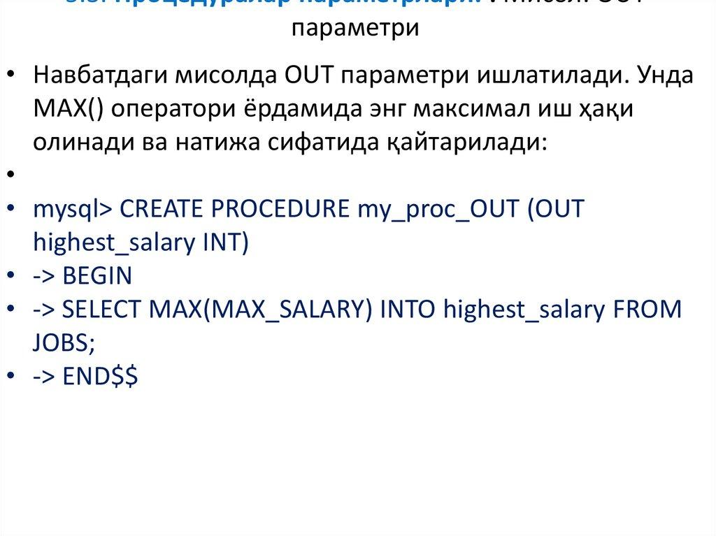иш ҳақини олади. Процедура ишга тушганда OUT сўзи МББТга