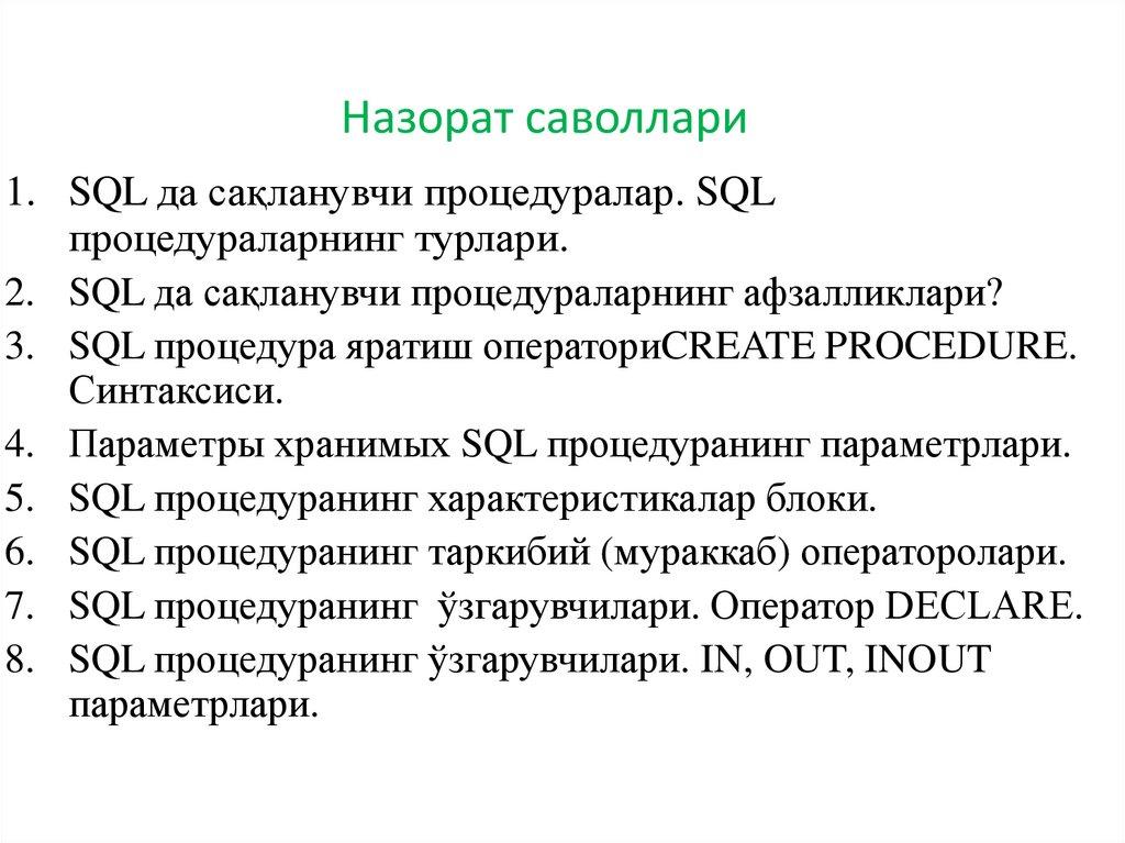 Назорат саволлари1. SQL да сақланувчи процедуралар. SQL