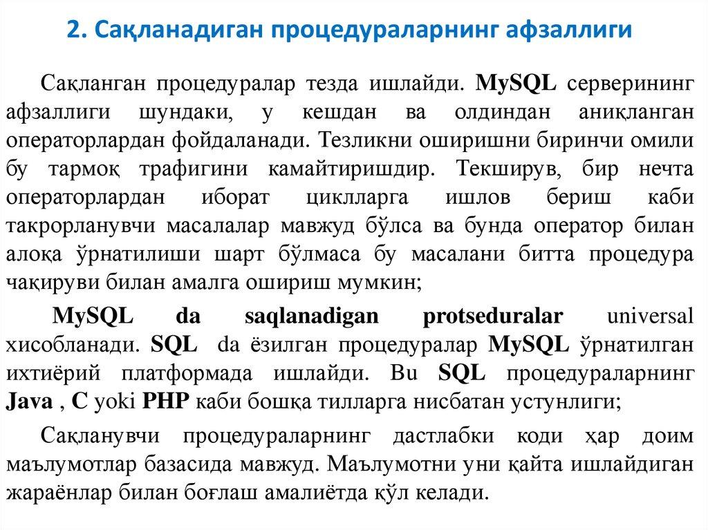 2. Сақланадиган процедураларнинг афзаллигиСақланган процедуралар тезда ишлайди. MySQL серверининг