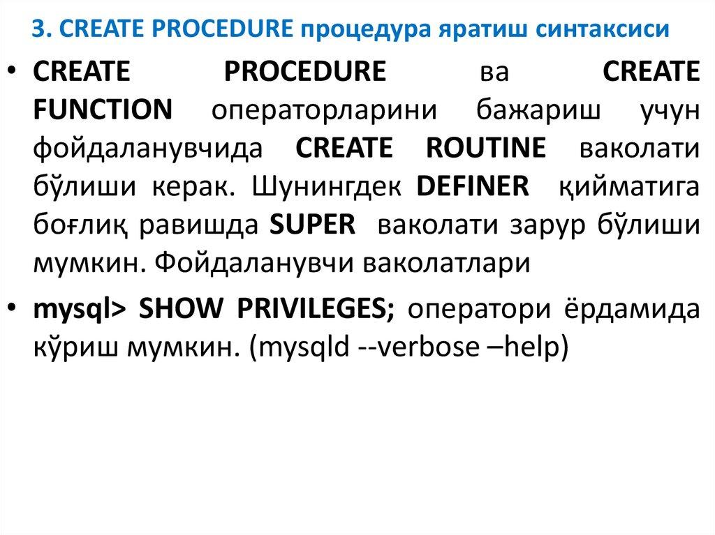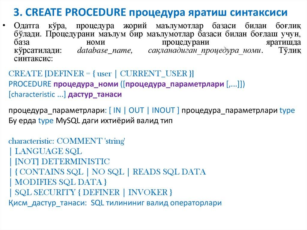 3. SQL процедура яратиш операториCREATE PROCEDURE.