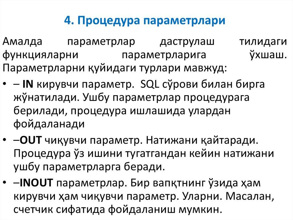 4. Параметры хранимых SQL процедуранинг параметрлари.