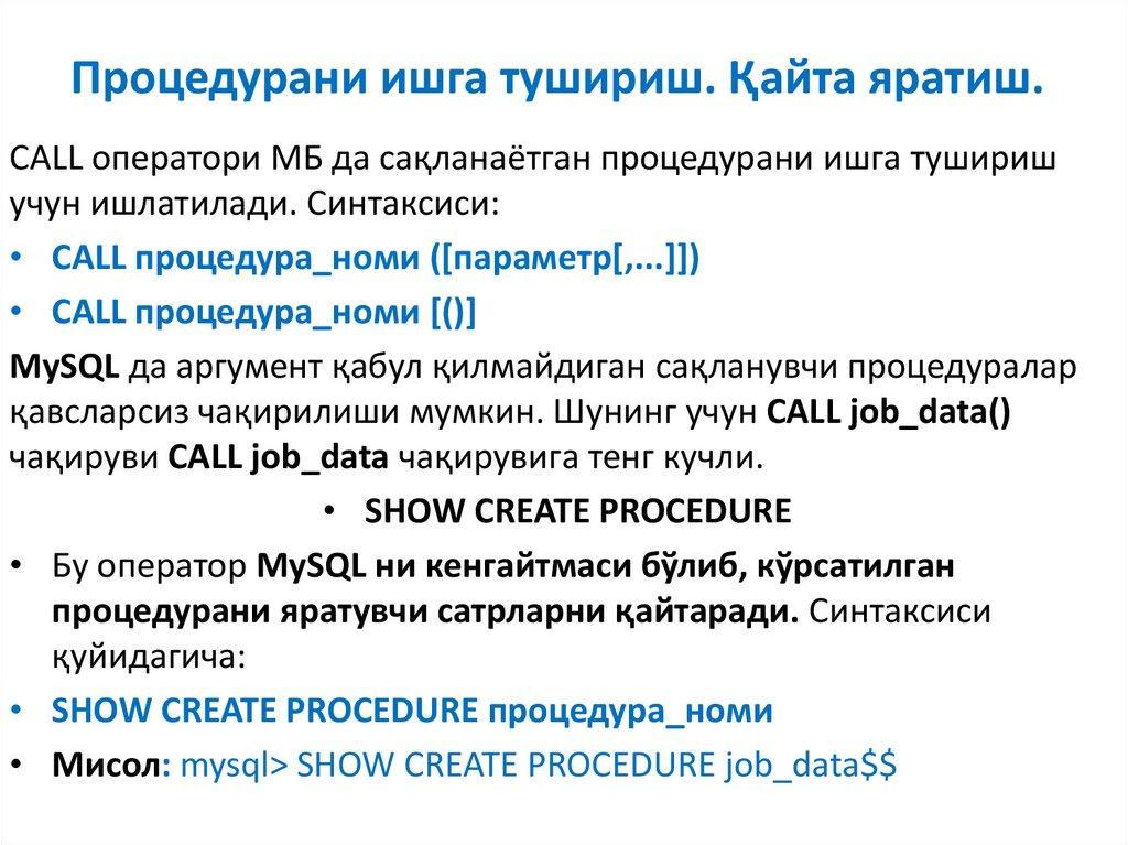 • CREATE PROCEDURE процедура_номи () …