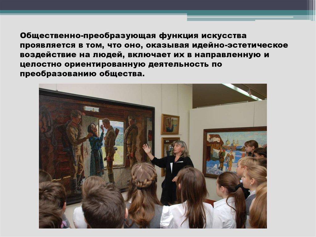 Общественно-преобразующая функция искусствапроявляется в том, что оно, оказывая идейно-эстетическое