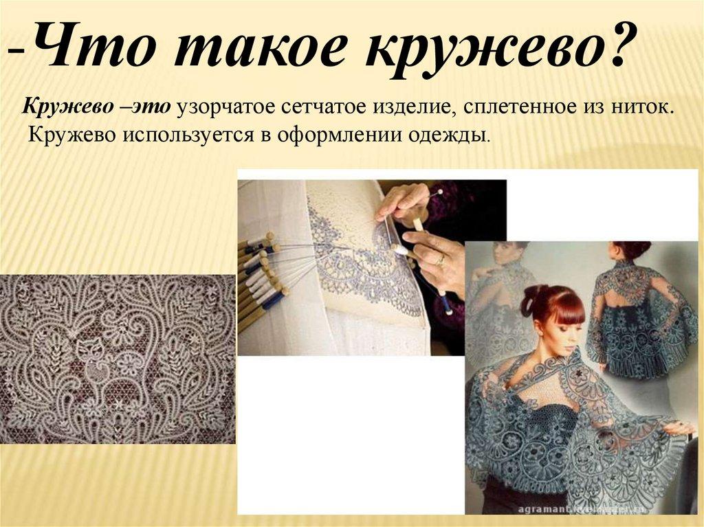-Что такое кружево?Кружево –это узорчатое сетчатое изделие, сплетенное из ниток.