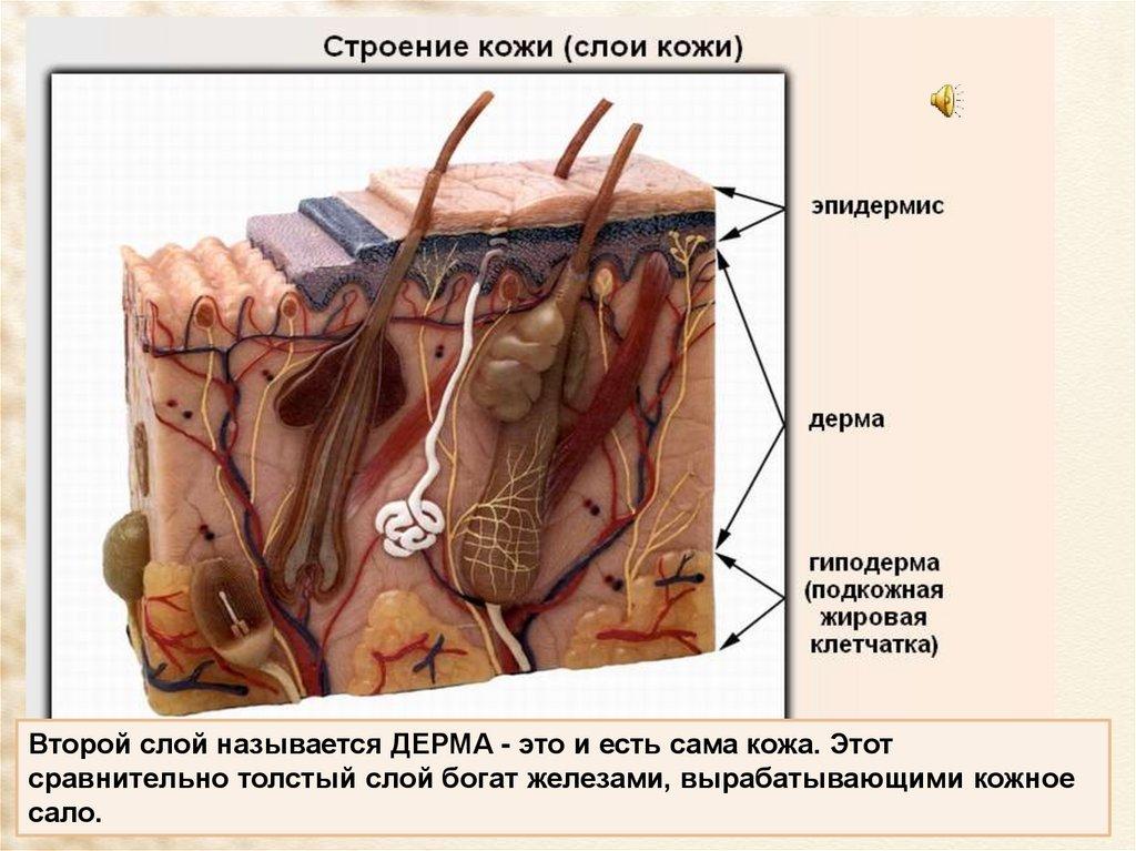 Второй слой называется ДЕРМА - это и есть сама кожа. Этотсравнительно толстый слой богат железами, вырабатывающими кожное