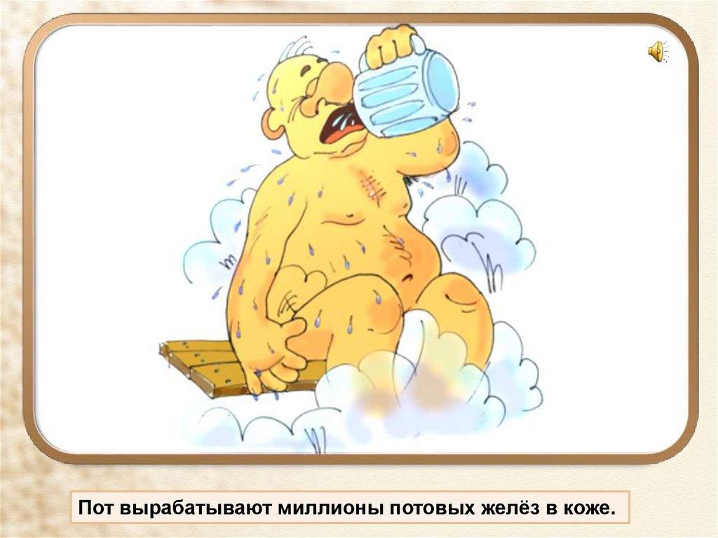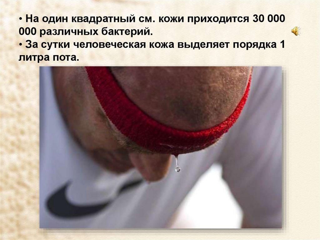 Пот вырабатывают миллионы потовых желёз в коже.15.