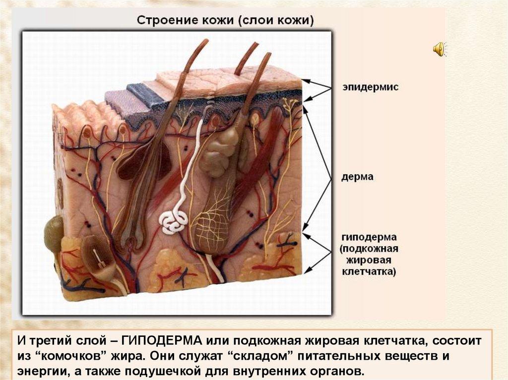 И третий слой – ГИПОДЕРМА или подкожная жировая клетчатка, состоитиз “комочков” жира. Они служат “складом” питательных веществ и