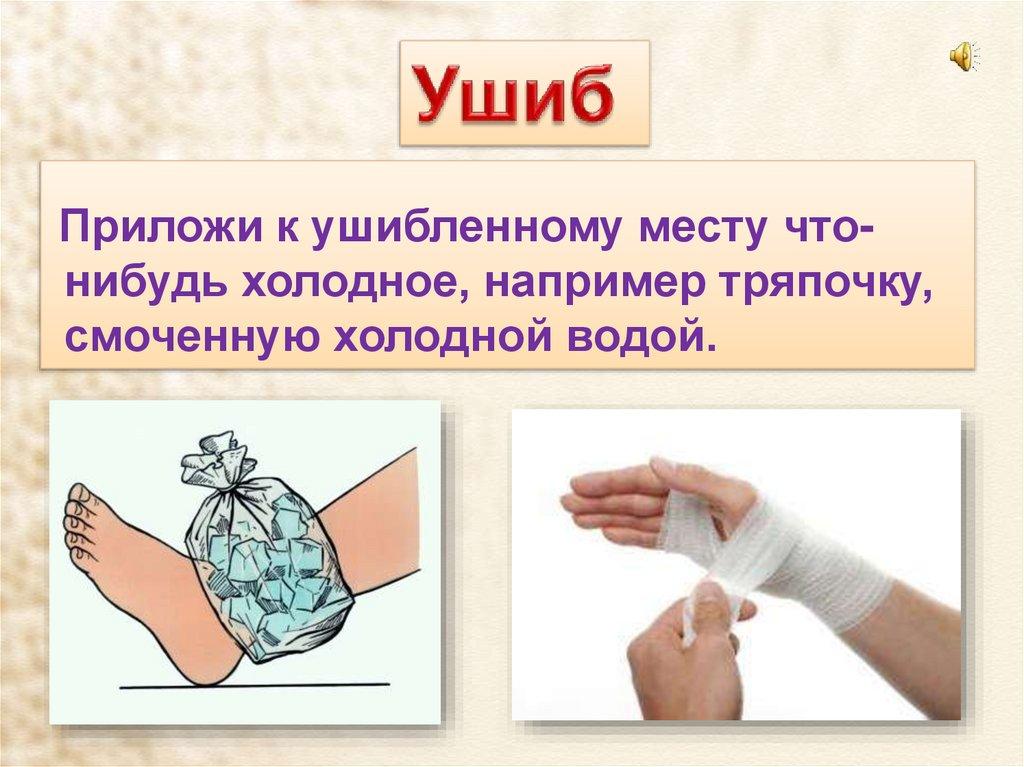Приложи к ушибленному месту чтонибудь холодное, например тряпочку,смоченную холодной водой.