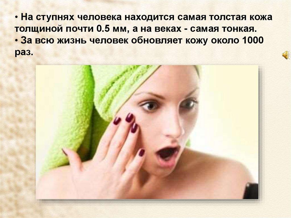 • На ступнях человека находится самая толстая кожатолщиной почти 0.5 мм, а на веках - самая тонкая.
