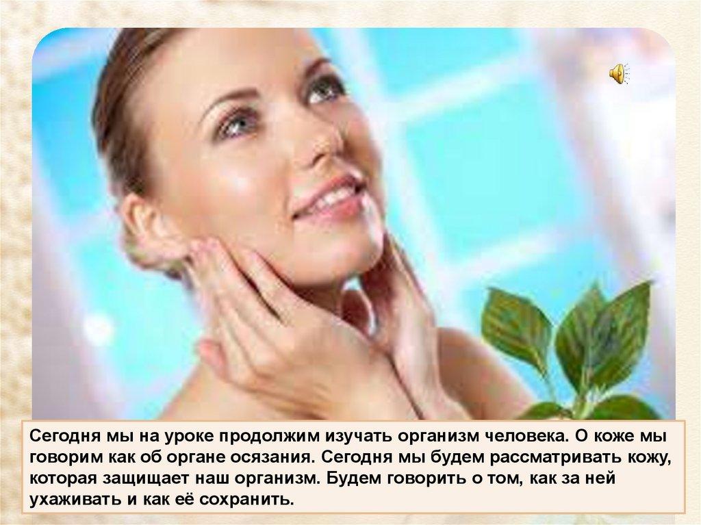 Сегодня мы на уроке продолжим изучать организм человека. О коже мыговорим как об органе осязания. Сегодня мы будем рассматривать кожу,