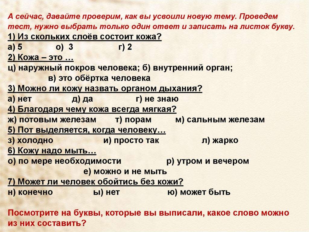 А сейчас, давайте проверим, как вы усвоили новую тему. Проведемтест, нужно выбрать только один ответ и записать на листок букву.