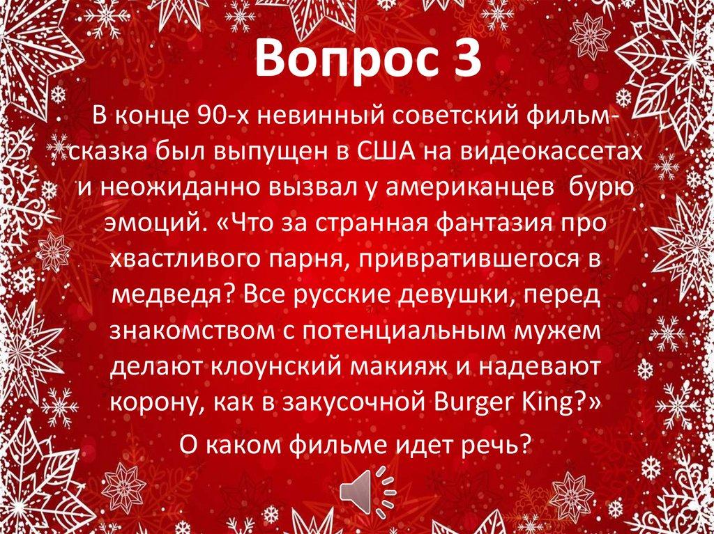 Вопрос 3В конце 90-х невинный советский фильмсказка был выпущен в США на видеокассетах