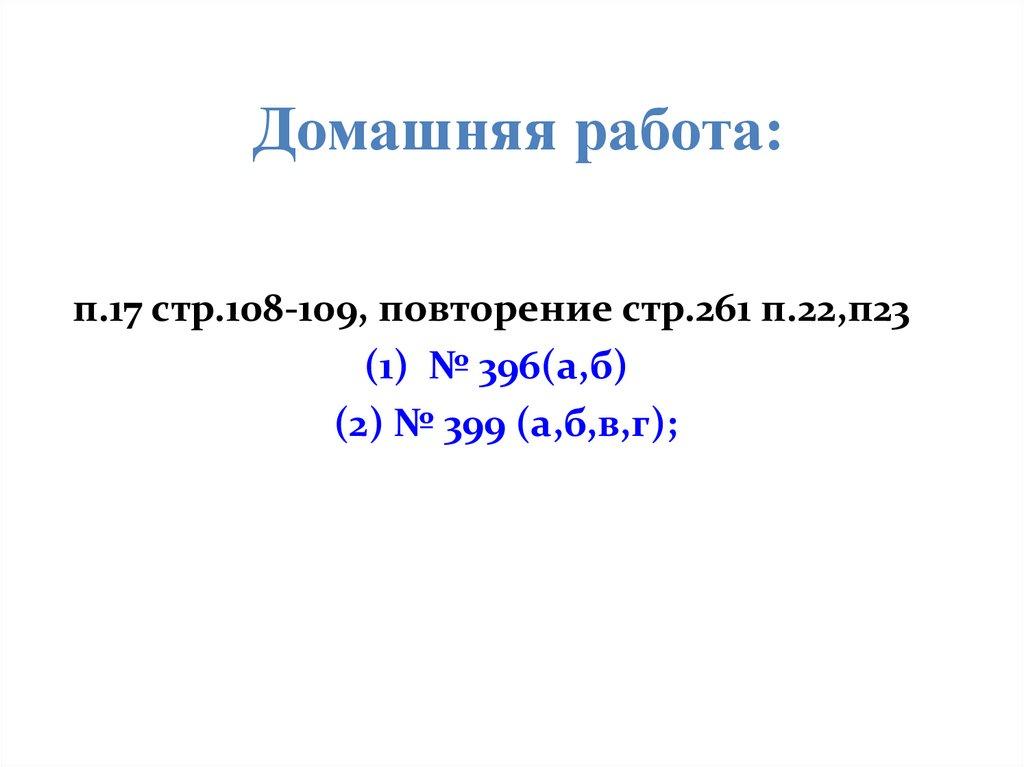 Домашняя работа:п.17 стр.108-109, повторение стр.261 п.22,п23