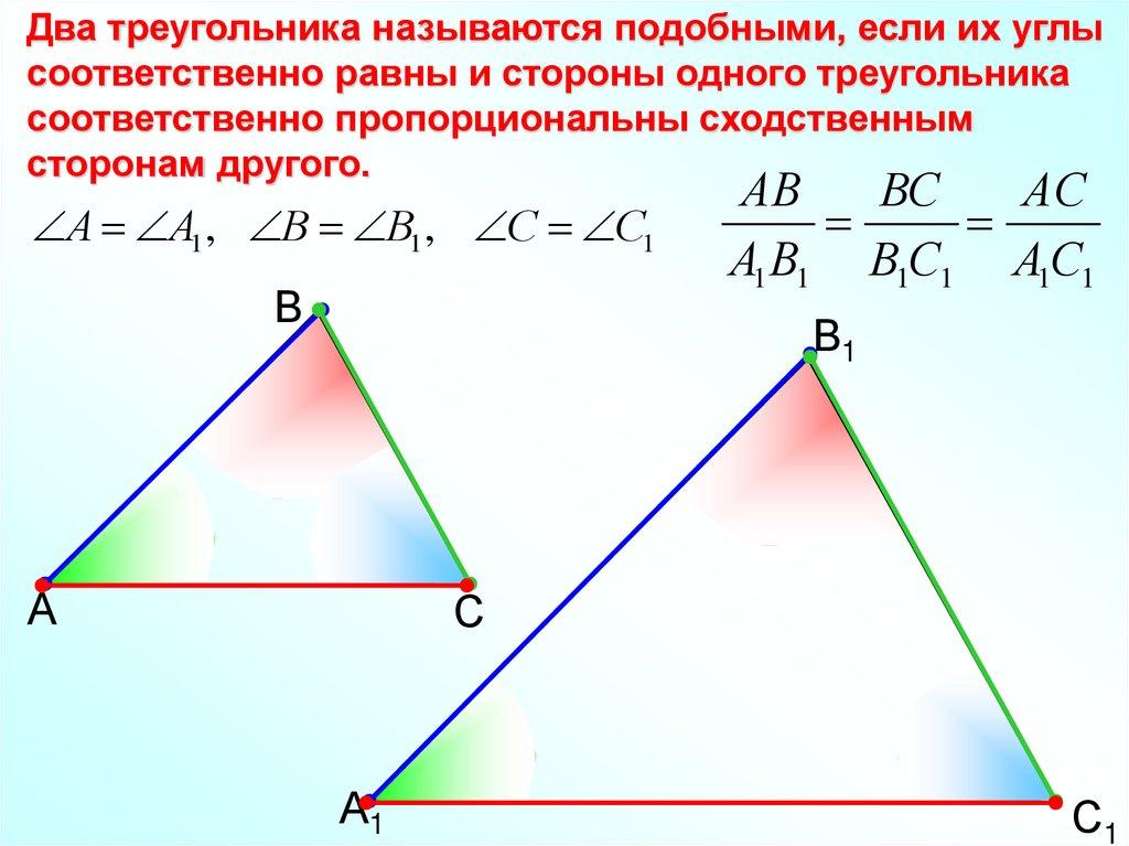 Два треугольника называются подобными, если их углысоответственно равны и стороны одного треугольника
