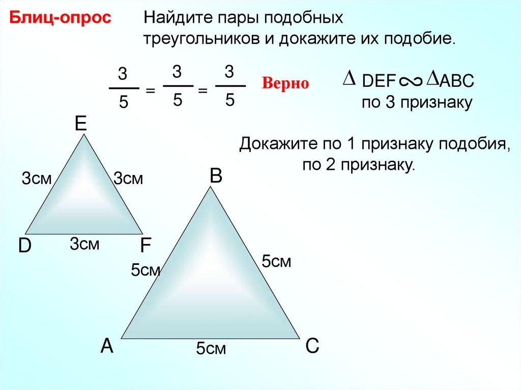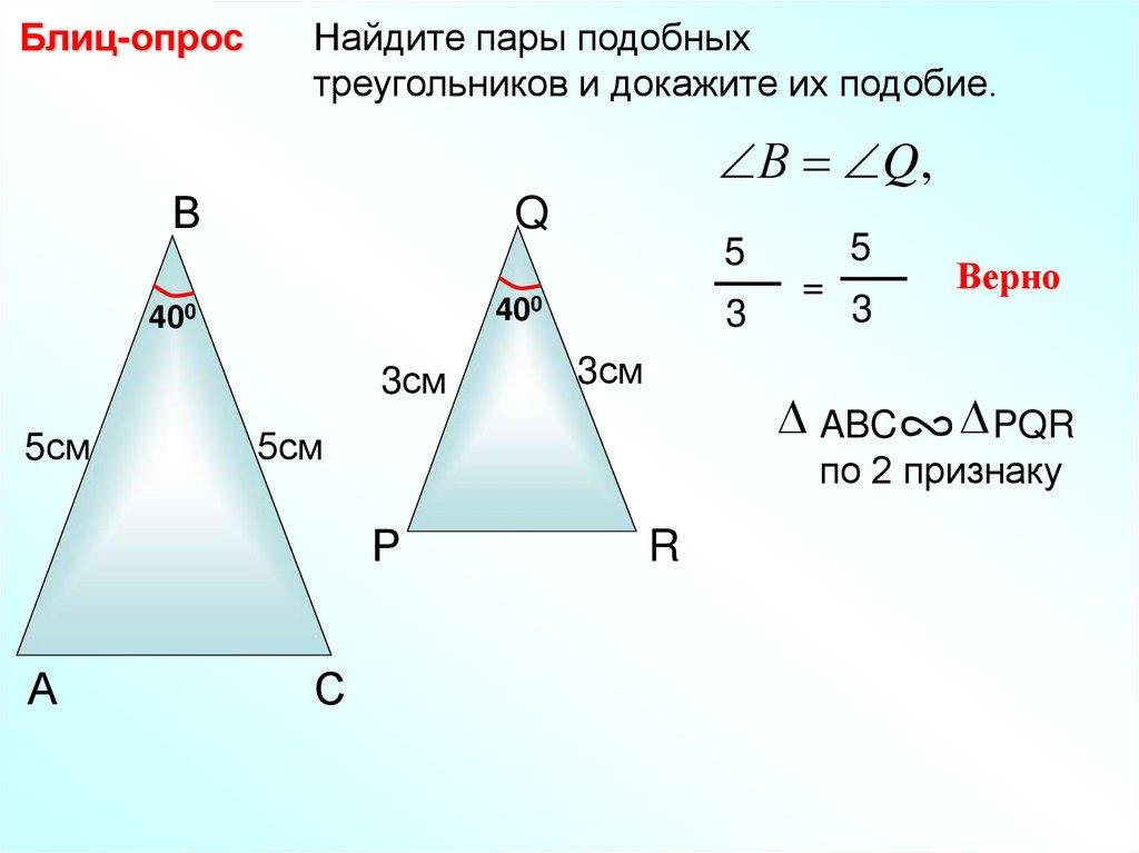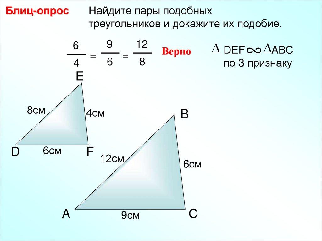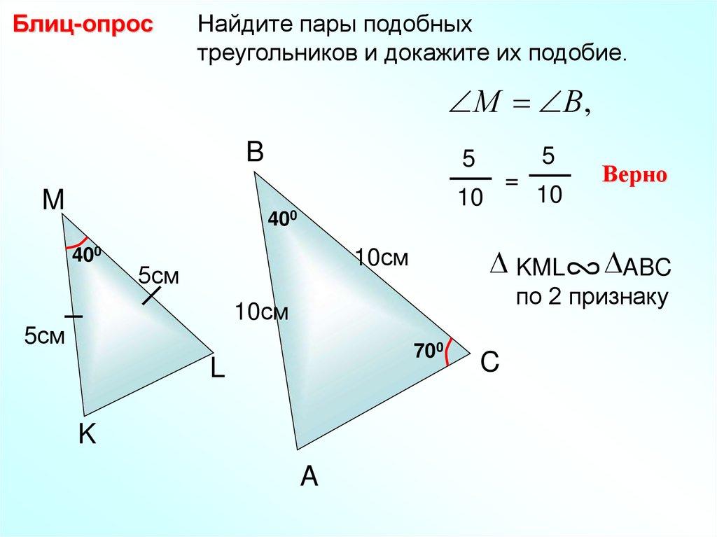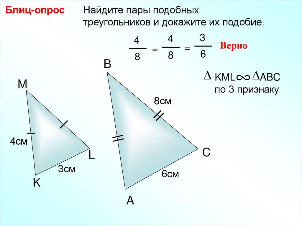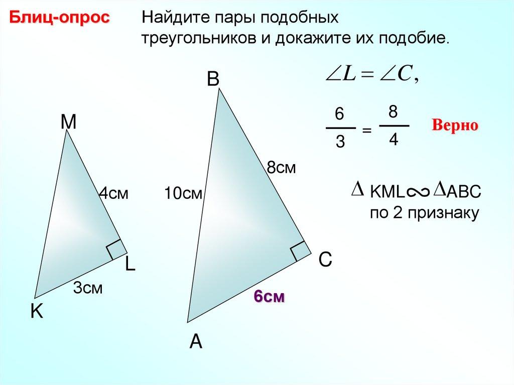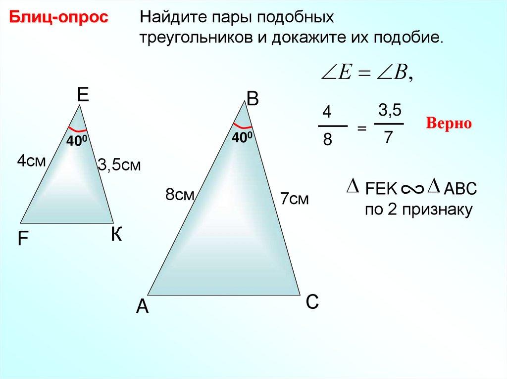 Блиц-опрос Найдите пары подобных треугольников идокажите их подобие.