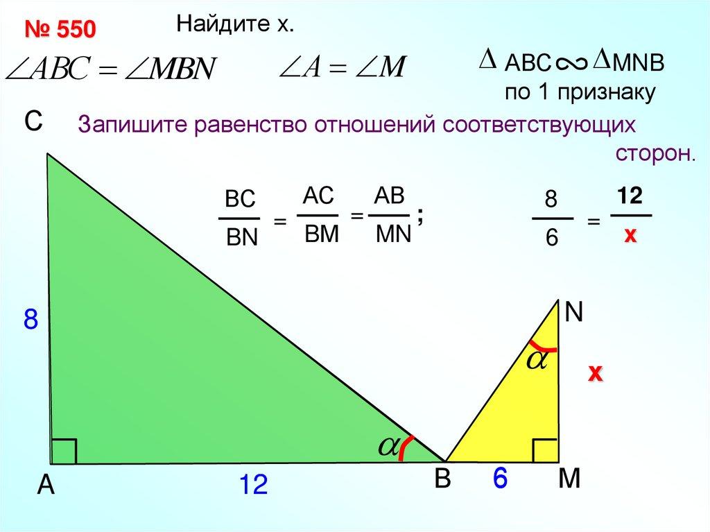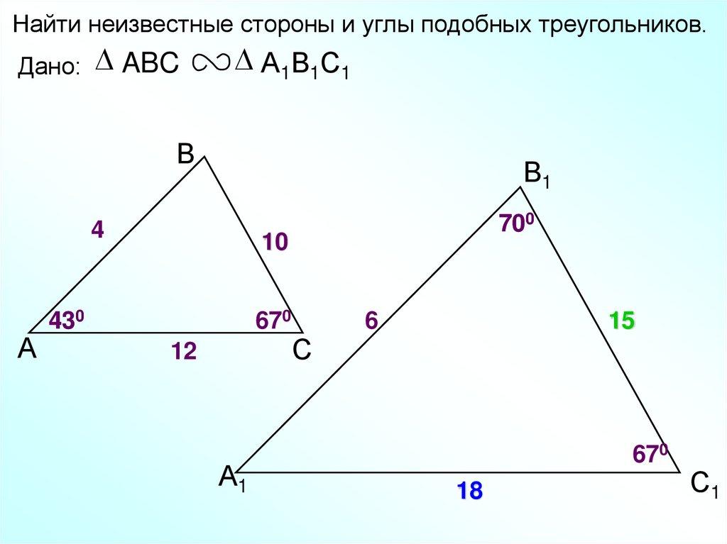 Найти неизвестные стороны и углы подобных треугольников.Дано: ABC